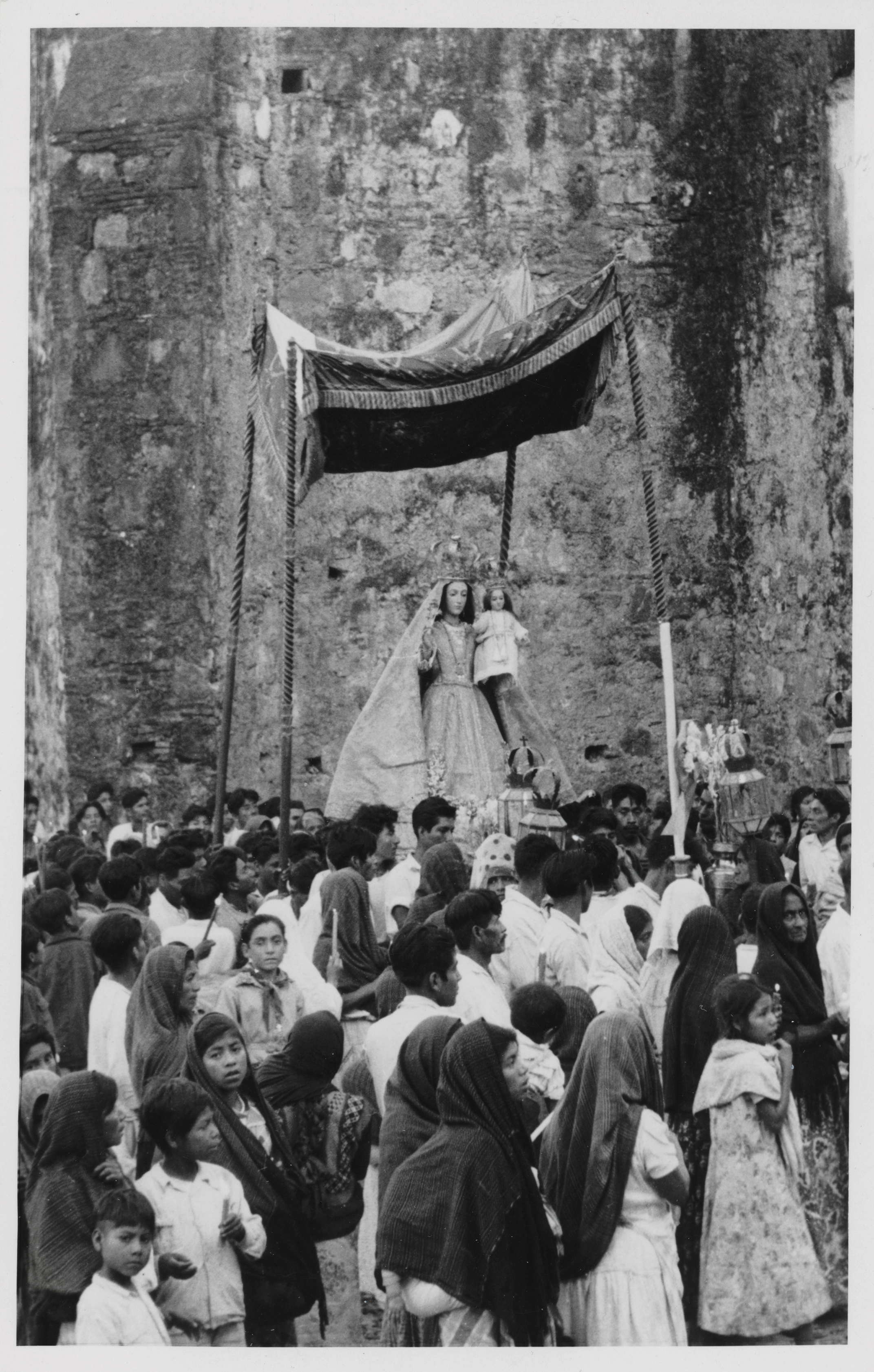 Virgen de la Purísima Concepción rodeada de sus devotos. Procesión celebrada el 8 de diciembre de 1953, en la comunidad de Ixcuintepec, Oaxaca.