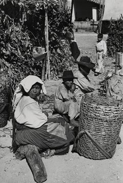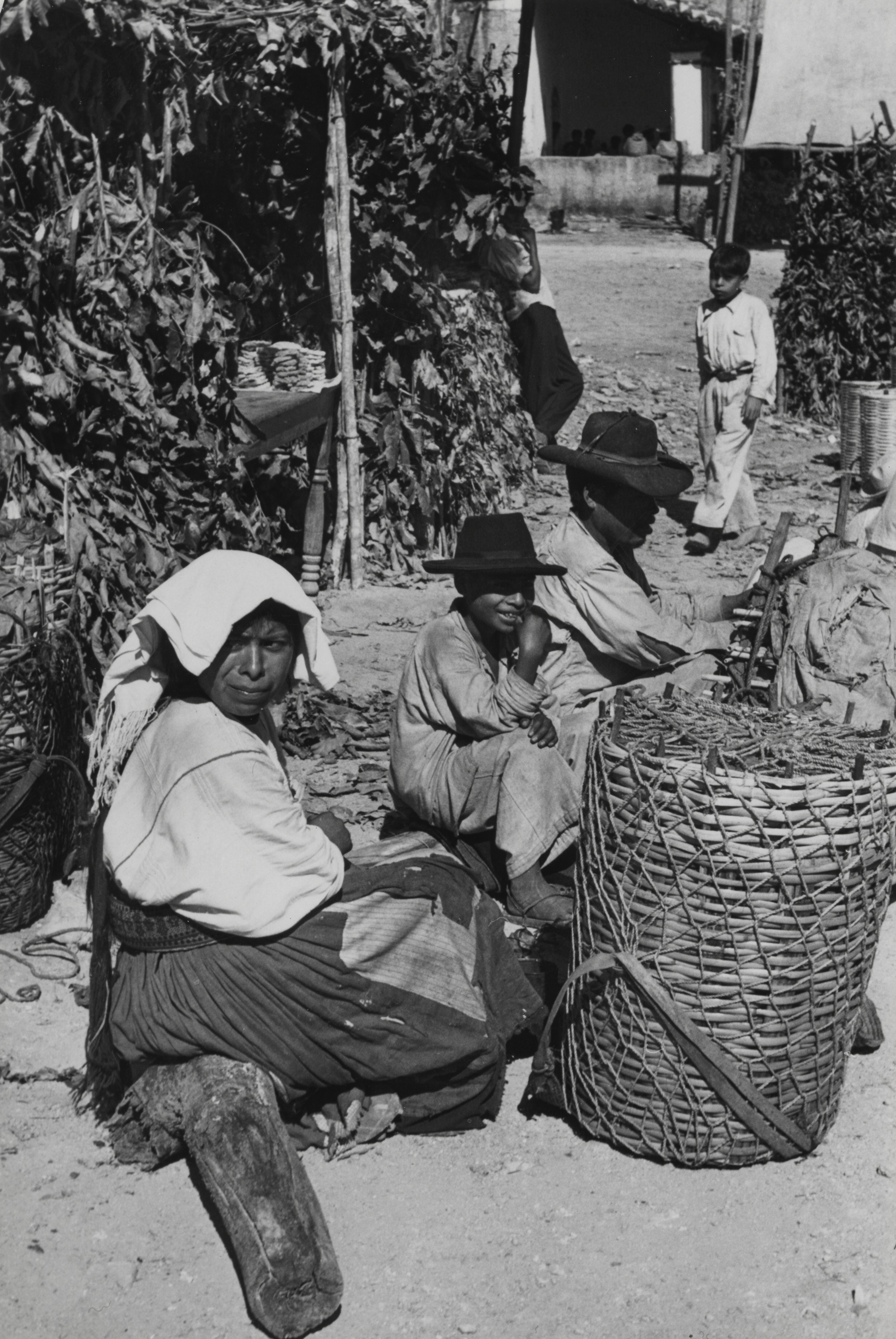 Mujer mixe de Tamazulápam, en la población de Ixcuintepec, Oaxaca. Ella se encuentra sentada sobre un tronco de madera, viste un huipil (blusa), tejido en telar de cintura, este se compone de tres lienzos unidos verticalmente por randas (ribetes) decorativas, el huipil (blusa) va metido en el refajo (falda) que es sostenido por una faja, lleva la cabeza cubierta por un rebozo para protegerse del sol. Frente a ella un canasto de carrizo envuelto en una red y lleva cintas para facilitar su transporte. A un lado de ella dos hombres, un niño y un adulto, visten pantalón y camisa de manta y los dos llevan sombreros de fieltro.