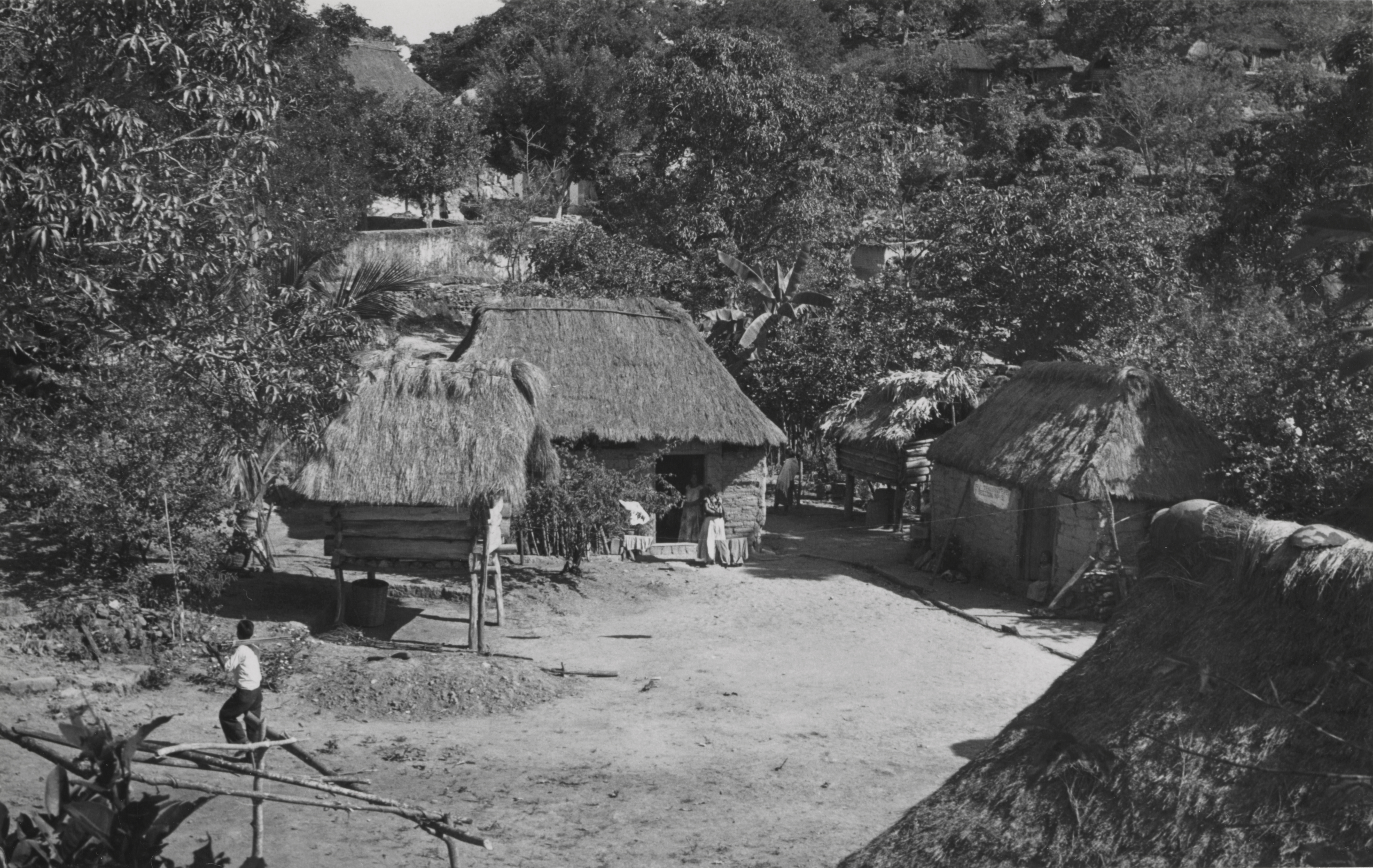 Arquitectura vernácula, en la comunidad mixe de Ixcuintepec, Oaxaca. A un lado de las viviendas pueden observarse los graneros=tse'x (mixe de Totontepec), se edificaban en alto para proteger los granos de los animales. Las casas=tajc (mixe de Totontepec), eran edificadas con estructuras de palos, las paredes se recubrían de lodo, y los techos de palma, no utilizaban clavos.
