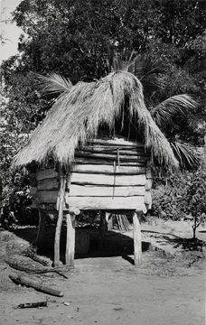 Coscomate (tse'x, mixe de Totontepec)= granero. Eran edificados en alto para proteger los granos de los animales, construidos de troncos de árboles y con techo de palma. En la imagen pueden observarse dentro del granero las mazorcas de maíz.