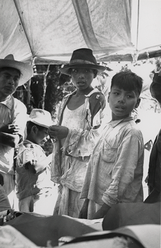 Niños Mixes en la feria de Santiago Ixcuintepec, Oaxaca. Uno de ellos lleva puesto en sombrero de fieltro.