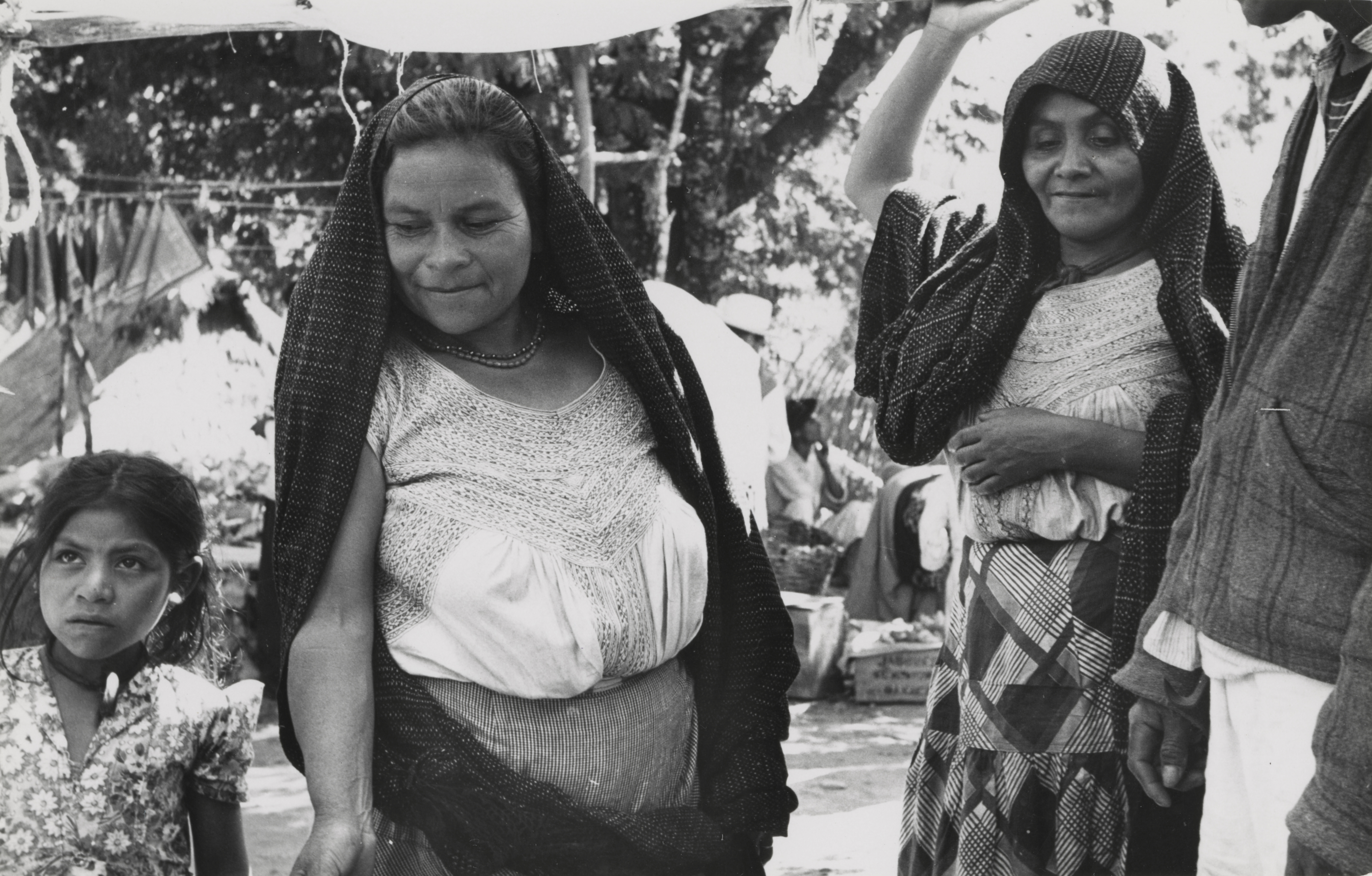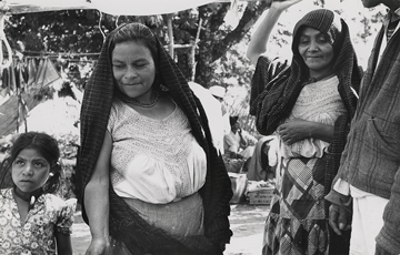 Mujeres mixes probablemente provenientes de Margaritas (de acuerdo a la autora). En la feria de Santiago Ixcuintepec, Oaxaca. Dos mujeres adultas visten blusas de manta industrial con bordados hechos con máquina, la blusa se compone de varias piezas, llevan faldas de pretina de tela industrial y se cubren la cabeza con un rebozo, una de ellas porta un collar de cuentas, al lado de una de ellas una niña observa atentamente.