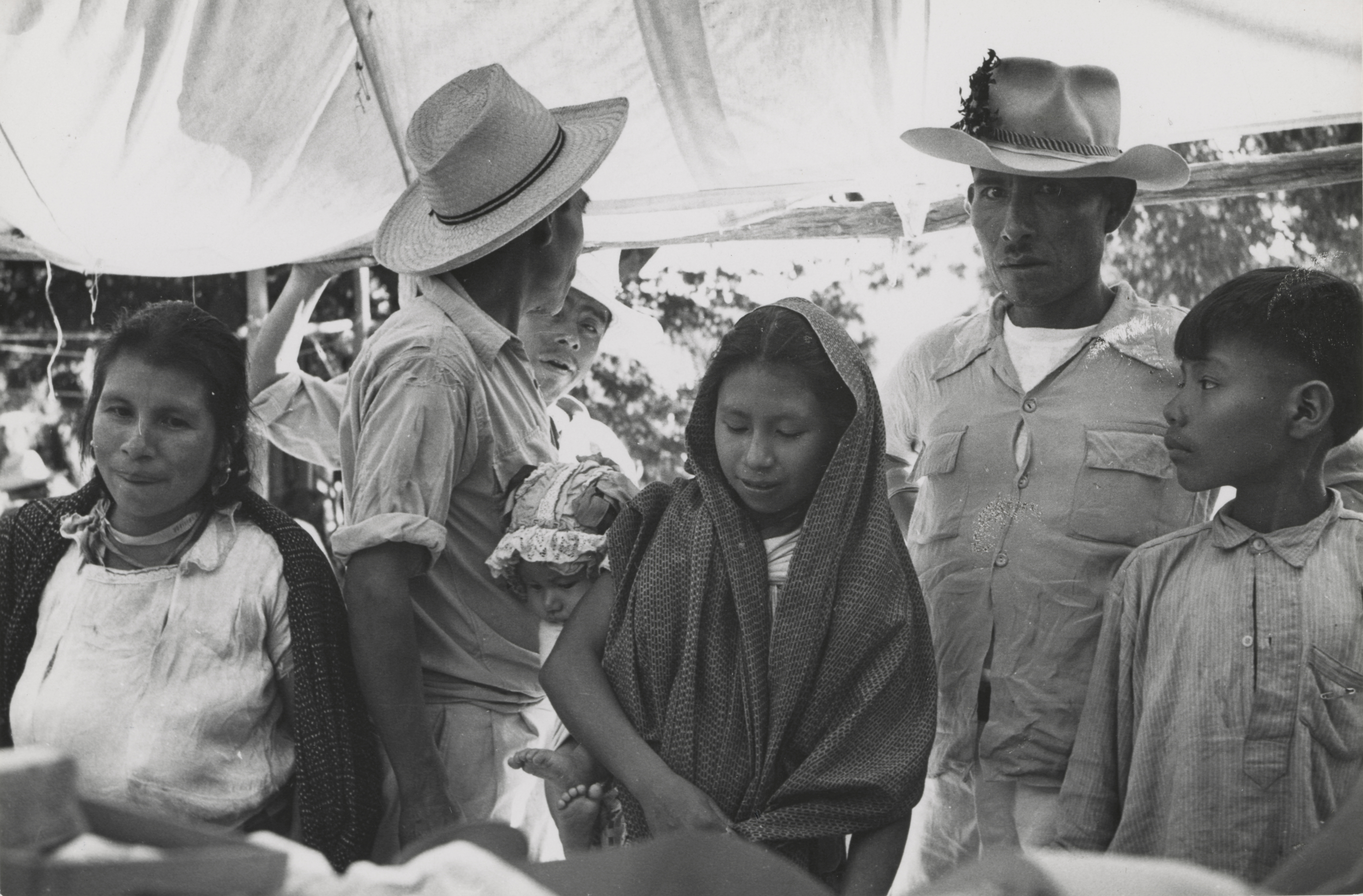 En la imagen, dos mujeres observando algunos objetos desplegados sobre una superficie, una de ellas lleva un rebozo que le cubre la cabeza y carga en su espalda un bebé, la otra lleva el rebozo sobre los hombros, y unas cintas en el cuello. Un hombre adulto observa atento a la cámara y frente a él un niño.