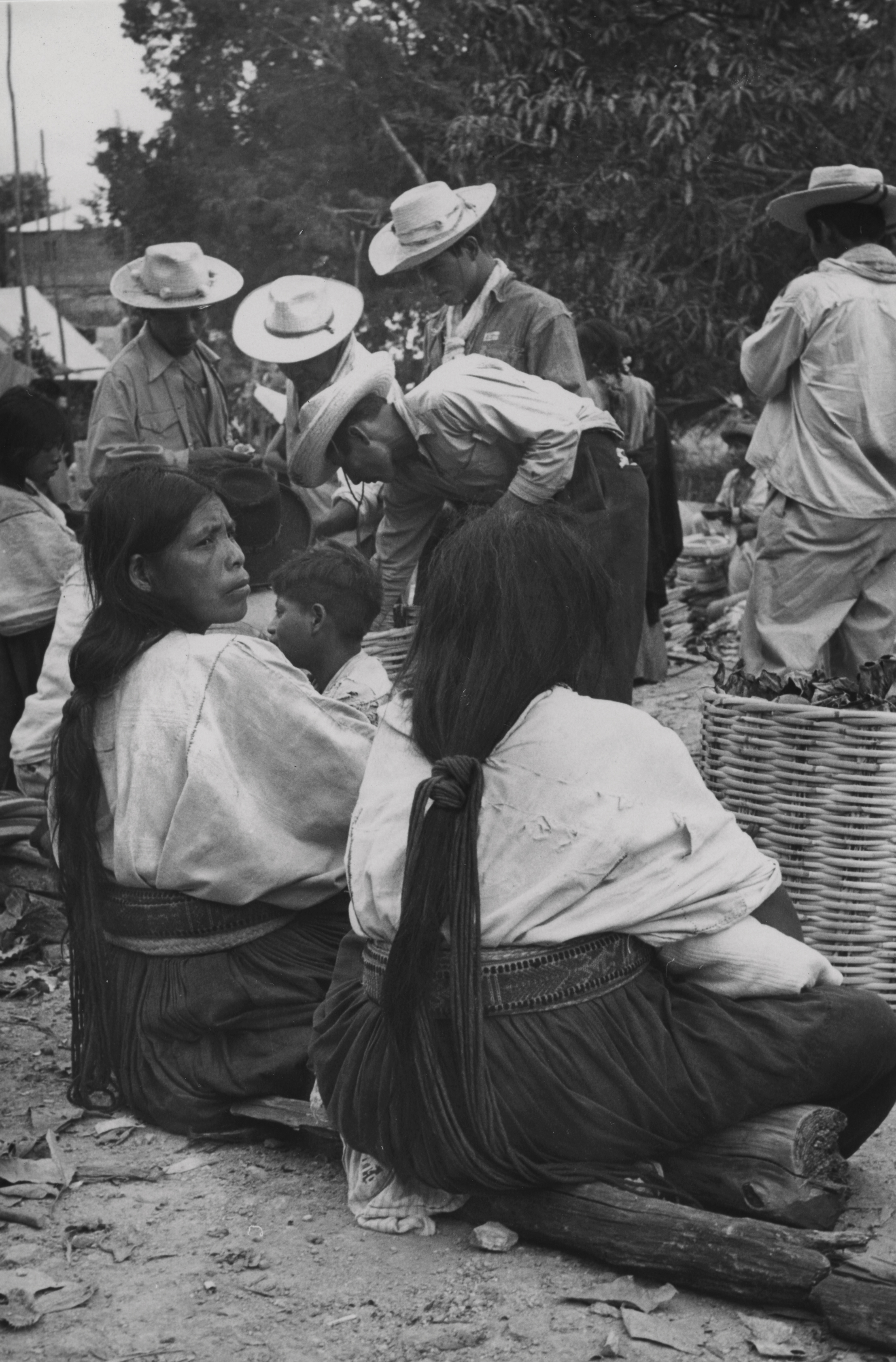 Mujeres Mixes provenientes de la comunidad de Tamazulápam, en la fiesta de Ixcuintepec, Oaxaca. Sentadas sobre un tronco de madera. Visten huipil (blusa) de algodón tejido en telar de cintura, de tres lienzos unidos verticalmente, este va metido en el enredo (falda); el cual tiene muchos pliegues y va sostenido a la cintura por una faja, tejida también en telar de cintura con motivos brocados de danzantes. El cabello recogido hacia atrás y sujeto por unos tlacoyales de lana. Frente a ellas un grupo de hombres con sombrero, revisando algo, dentro de los canastos de carrizo.
