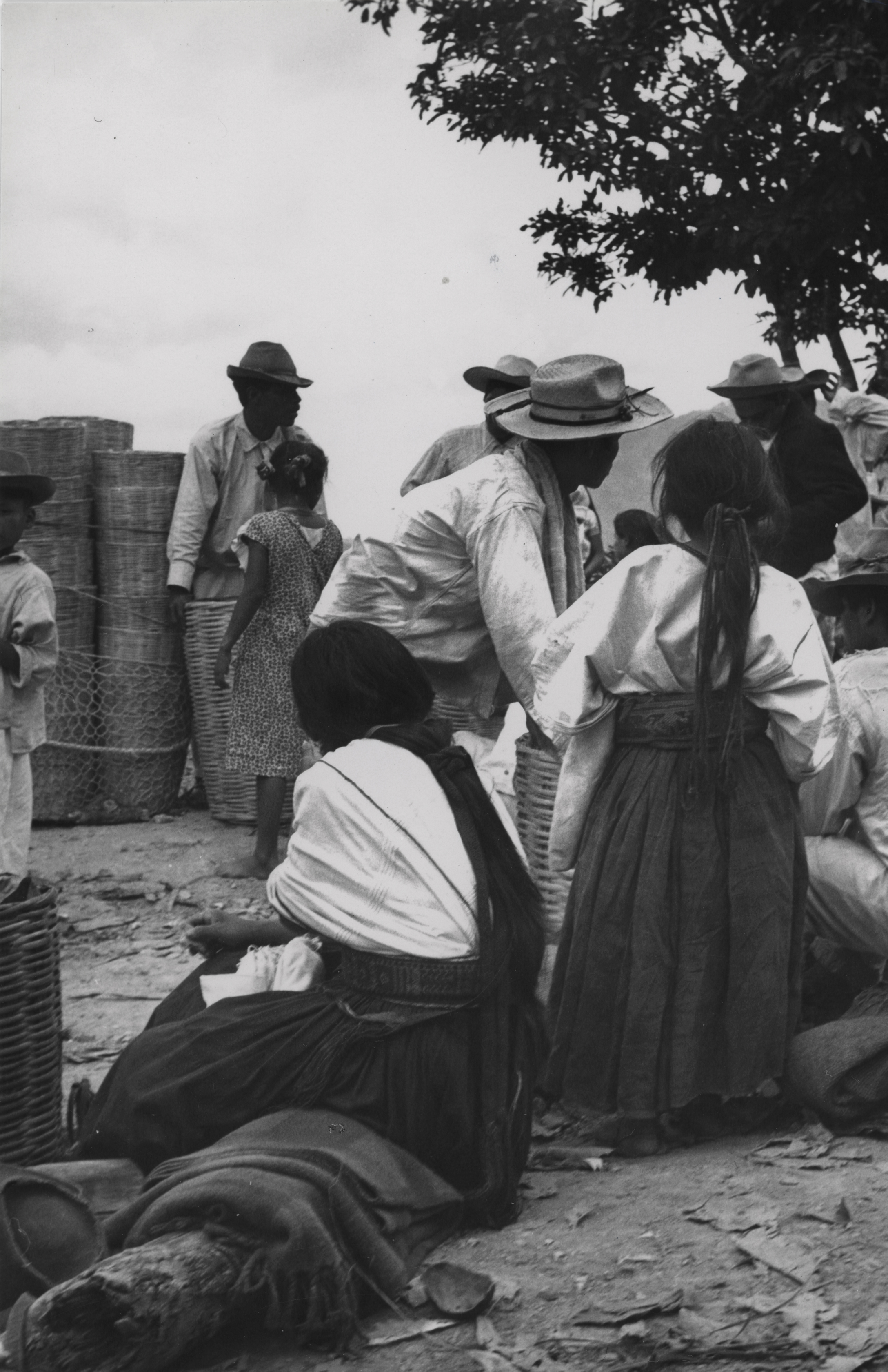 Mujeres Mixes provenientes de la comunidad de Tamazulápam, en la fiesta de Ixcuintepec, Oaxaca. Una de ellas se encuentra sentada sobre un tronco de madera y la niña de pie. Visten huipil (blusa) de algodón tejido en telar de cintura, de tres lienzos unidos verticalmente, este va metido en el enredo (falda) y va sostenido a la cintura por una faja, tejida también en telar de cintura con motivos brocados de danzantes. El cabello recogido hacia atrás y sujeto por unos tlacoyales de lana. Se aprecian otras personas alrededor y al fondo unos canastos de carrizo apilados y envueltos en una red de ixtle.