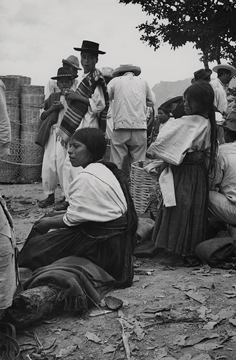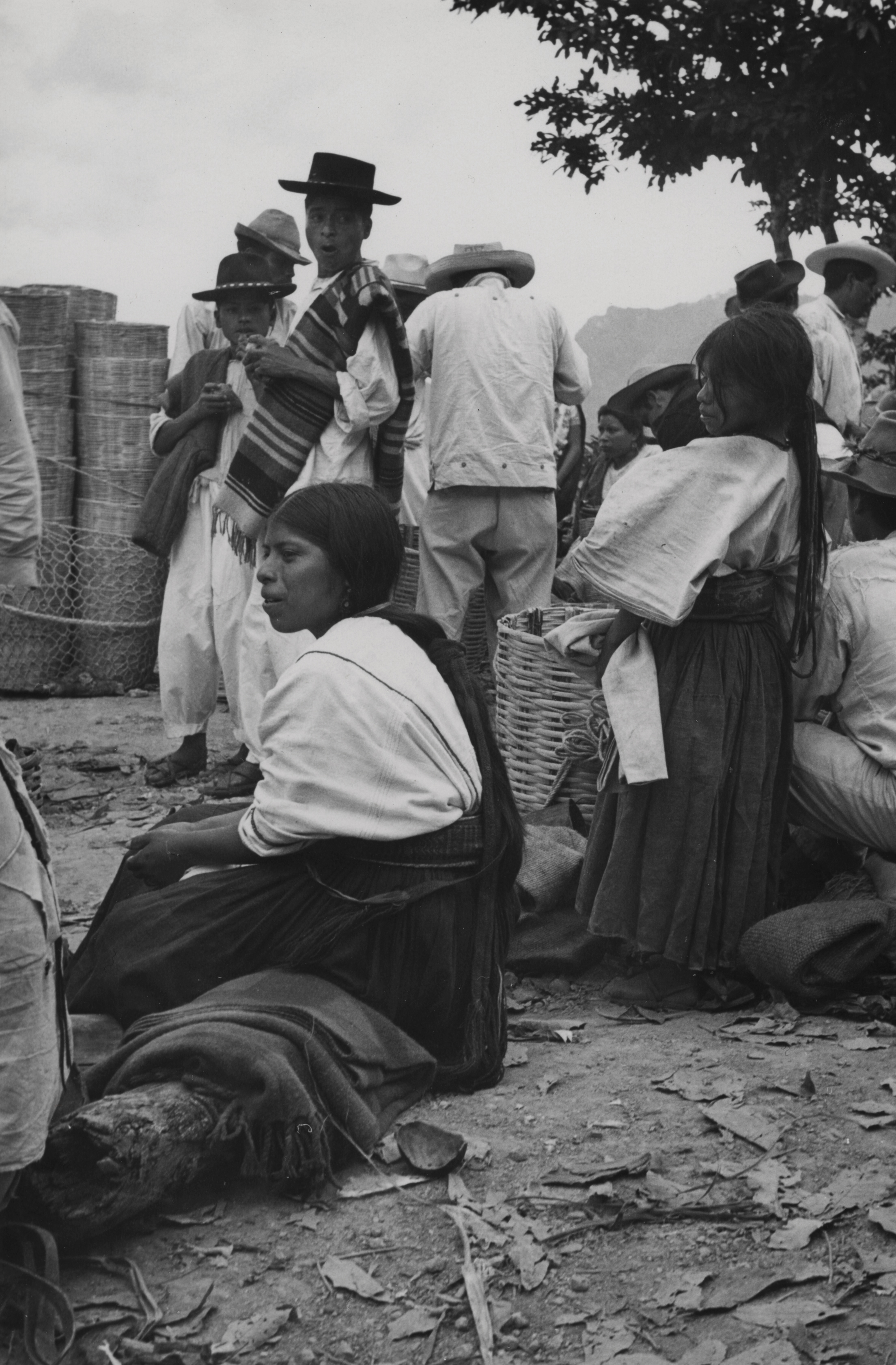 Mujeres Mixes provenientes de la comunidad de Tamazulápam, en la fiesta de Ixcuintepec, Oaxaca. Una de ellas se encuentra sentada sobre un tronco de madera y la niña de pie. Visten huipil (blusa) de algodón tejido en telar de cintura, de tres lienzos unidos verticalmente, este va metido en el enredo (falda) y va sostenido a la cintura por una faja, tejida también en telar de cintura con motivos brocados de danzantes. El cabello recogido hacia atrás y sujeto por unos tlacoyales de lana.A un lado de ellas unos jóvenes, vistiendo camisa y calzón de manta, con sombreros de fieltro, uno de ellos lleva en el hombro izquierdo un gabán tejido en telar de cintura.
