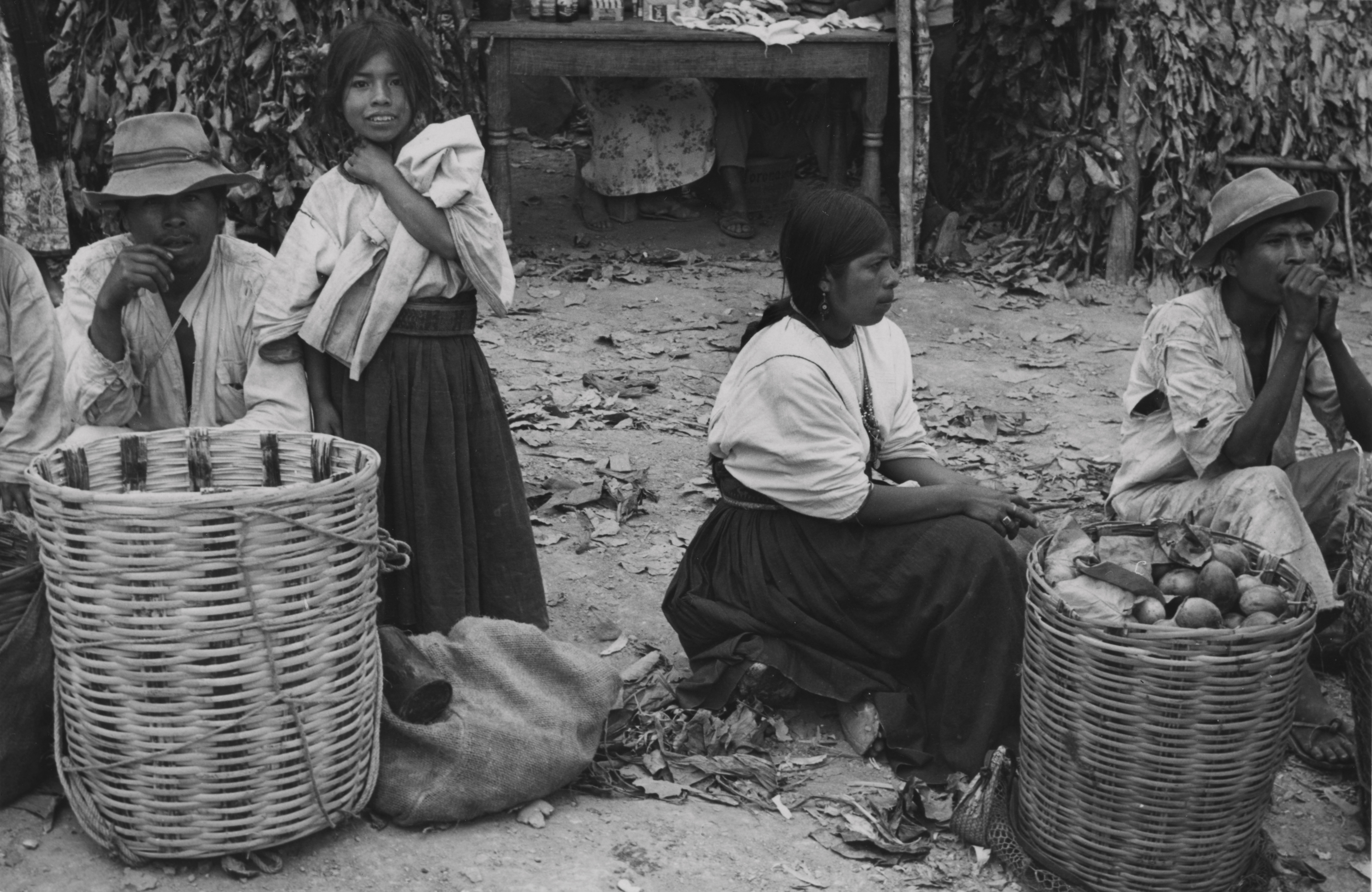 Mujeres mixes provenientes de la comunidad de Tamazulápam, en la fiesta de Ixcuintepec, Oaxaca. Una de ellas se encuentra sentada sobre un tronco de madera. Visten huipil (blusa) de algodón tejido en telar de cintura, de tres lienzos unidos verticalmente, este va metido en el enredo (falda); el cual tiene muchos pliegues y va sostenido a la cintura por una faja, tejida también en telar de cintura con motivos brocados de danzantes. El cabello recogido hacia atrás. La niña que se encuentra de pie, viste de la misma manera y frente a ella en el suelo un costal elaborado de ixtle. Frente a ellas canastos elaborados de carrizo y uno de estos contiene granadas de moco como se le llama popularmente o granadillas, Passiflora ligularis (nombre científico).Junto a ellas dos hombres, los cuales llevan sombreros de fieltro y visten camisas con muchos remiendos.
