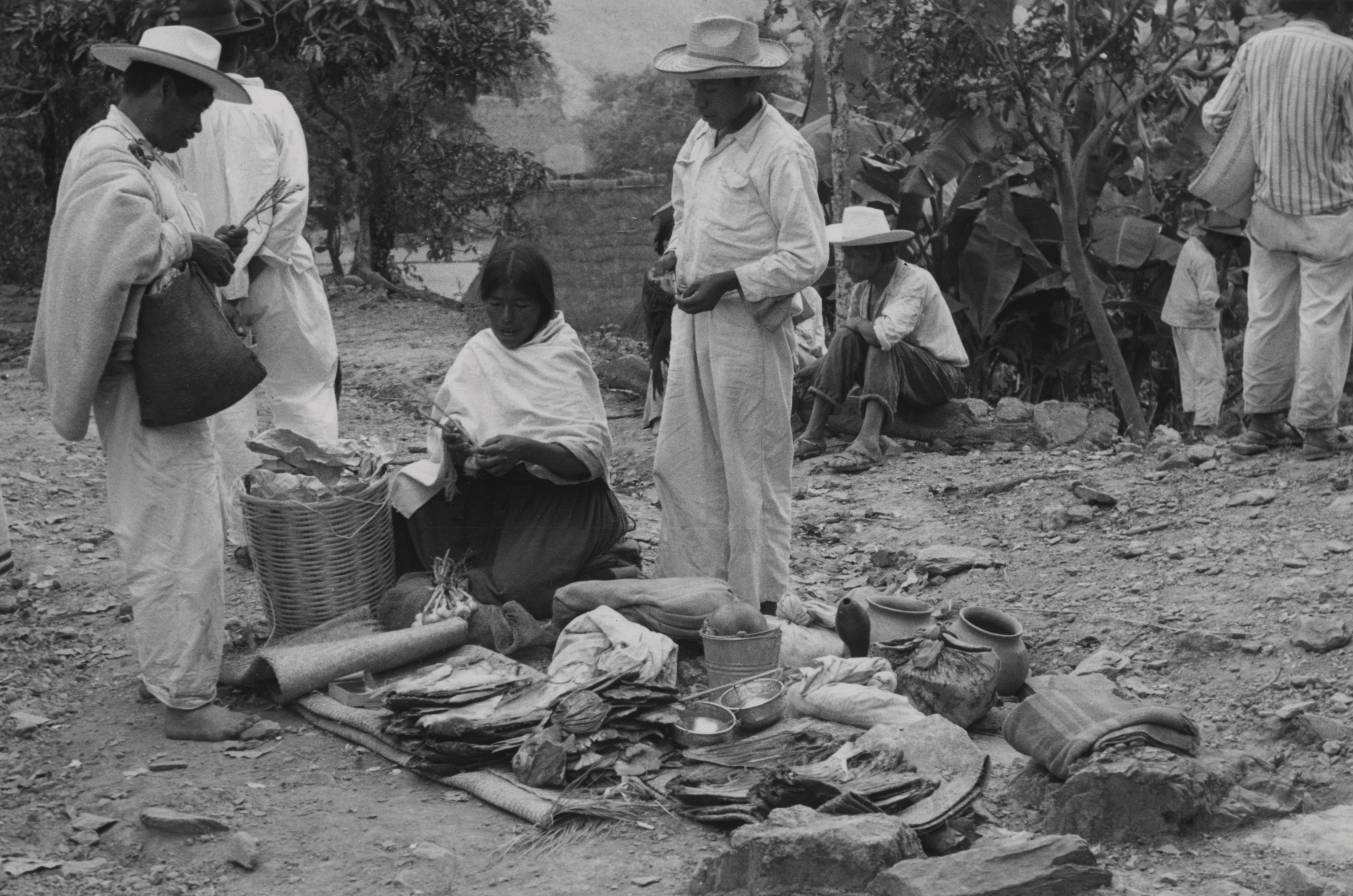 Mixes provenientes de la comunidad de Tamazulápam, vendiendo sus productos en la fiesta de Ixcuintepec, Oaxaca. Sobre un petate se aprecian sus productos, pescado seco, ajos, etc. Su interlocutor, de pie viste calzón y camisa de manta, lleva un sombrero de palma y en el hombro una cobija, bajo el brazo, un morral tejido en telar de cintura, este es de lana, en sus manos sostiene unos ajos.