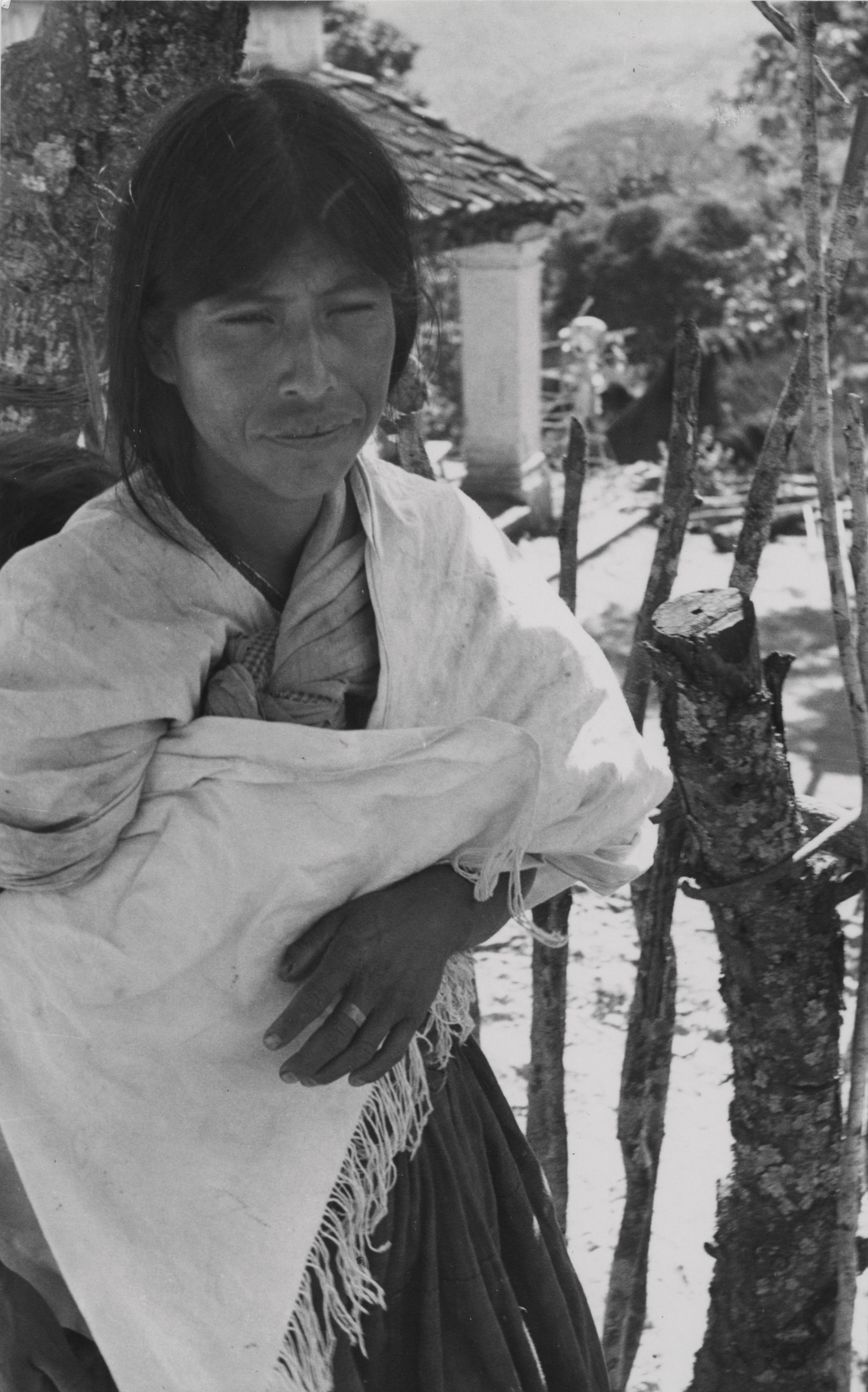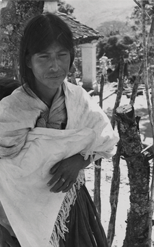 Mujer mixe de Tamazulápam, en la comunidad de Ixcuintepec, Oaxaca. Lleva un rebozo que le cubre el torso, al parecer carga un bebé, lleva su cabello recogido hacia atrás.