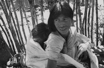 Mujer mixe proveniente de la comunidad de Tamazulápam, en la fiesta de Ixcuintepec, Oaxaca. Carga en la espalda a un bebé con la ayuda de un lienzo el cual está anudado en el pecho y lo cubre con un rebozo.