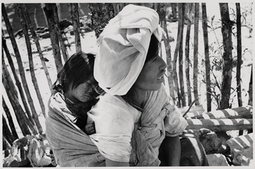Mujer sentada de cuclillas, carga en la espalda un bebé, con la ayuda de un lienzo, el cual está anudado en el pecho y se cubre la cabeza con un rebozo, de acuerdo a la autora ella proviene de la comunidad de Tamazulápam, la imagen fue tomada en la fiesta de Ixcuintepec, Oaxaca.