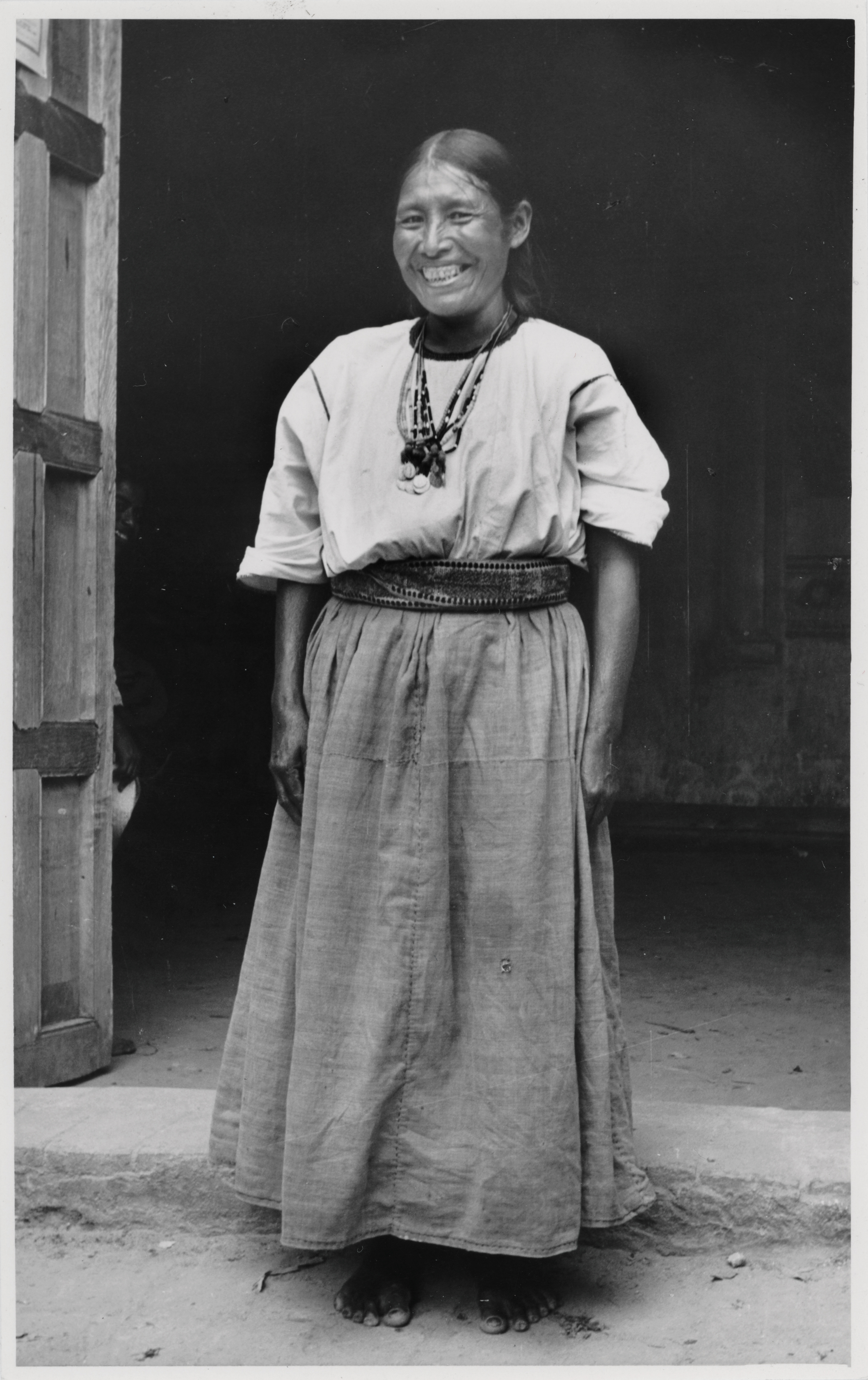 Mujer mixe de la comunidad de Tamazulápam, Oaxaca. Viste un huipil (blusa) amplio al parecer de tela comercial, compuesto de tres lienzos unidos verticalmente por randas, con una abertura circular bordada para introducir la cabeza, el huipil va metido en un enredo, tejido en telar de cintura y este a su vez está sostenido en la cintura por una faja, la cual lleva brocado un motivo de danzante (probablemente hecho en la comunidad de Jalieza),complementa su indumentaria con varios collares de cuentas, con medallones y pequeñas bolitas hechas de lana.