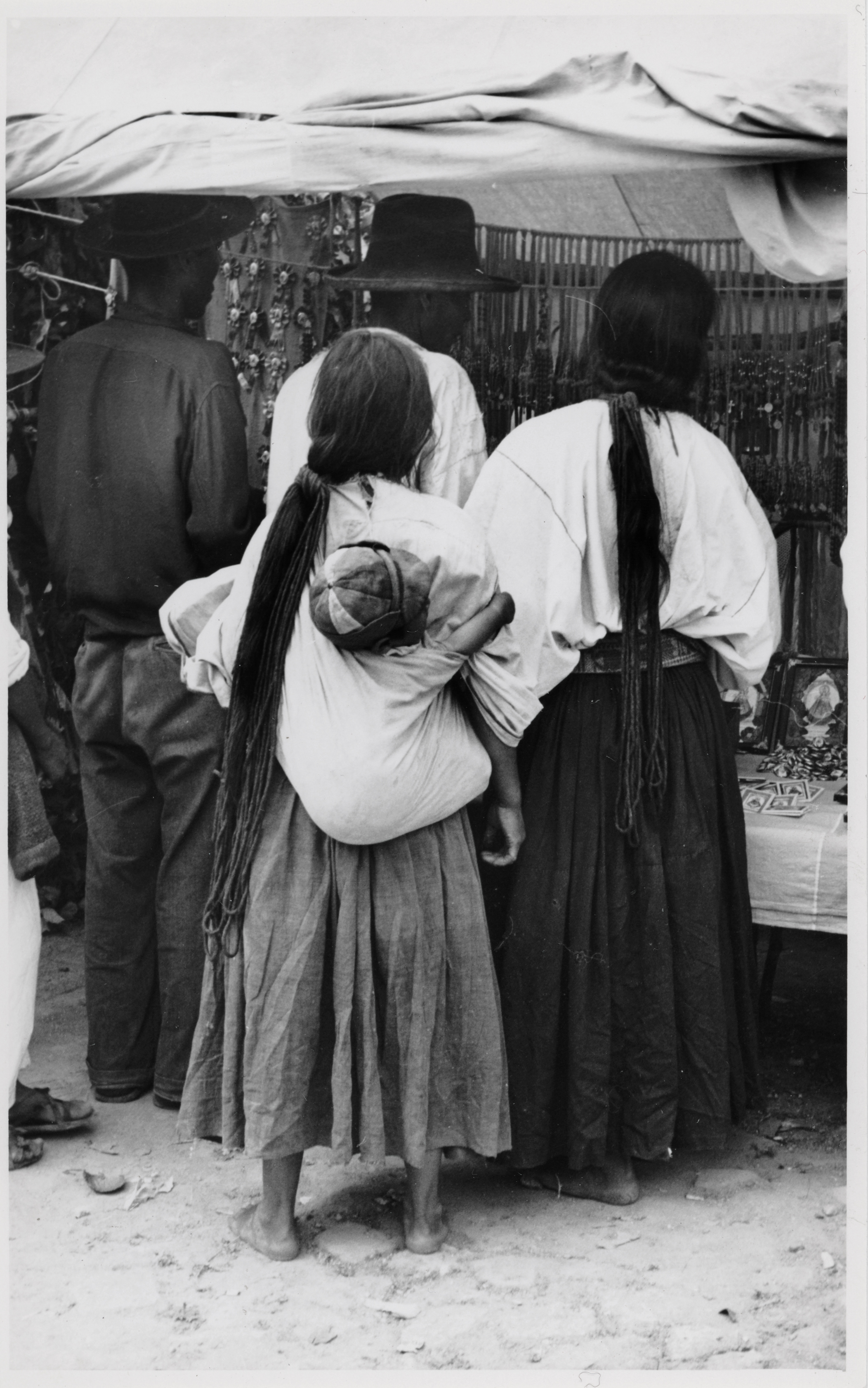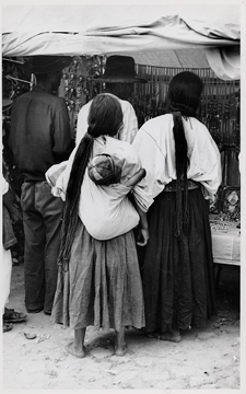Mujeres Mixes de Tamazulápam, en la fiesta de Ixcuintepec, Oaxaca. De espaldas las dos mujeres vistiendo su indumentaria, que consiste en huipil (blusa) y enredo (falda) sostenido por una faja, una de ellas cargando un niño en su espalda. Llevan el cabello anudado con cintas tejidas en telar de cintura y con los hilos de urdimbre sueltos, los cuales cuelgan sobre sus espaldas. Observando los objetos religiosos que se encuentran sobre una mesa y sobre unos cordones. Junto a ellas dos hombres vistiendo ropa industrial y con sombreros de fieltro.