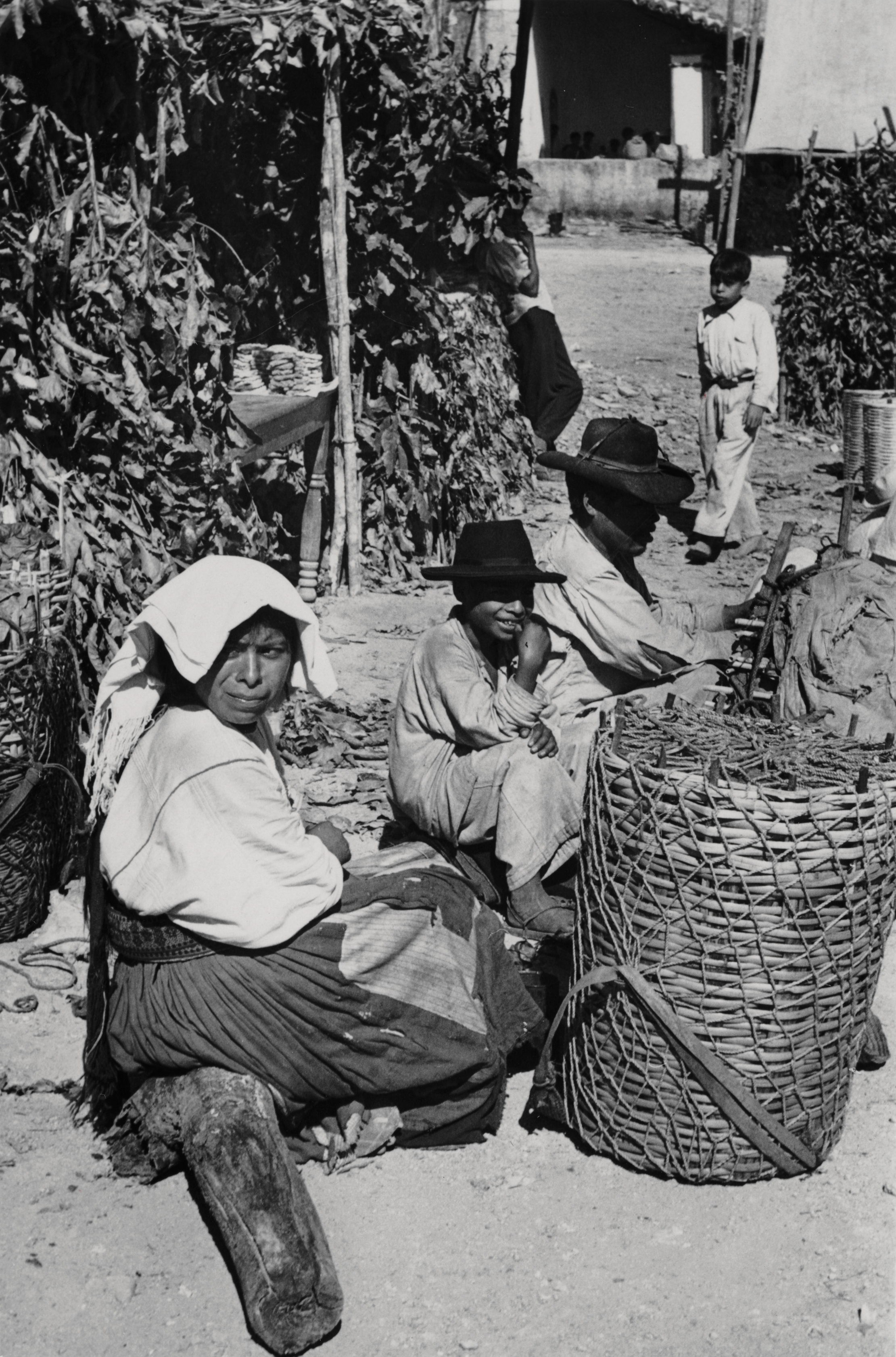 Mujer mixe de Tamazulápam, en la población de Ixcuintepec, Oaxaca. Ella se encuentra sentada sobre un tronco de madera, viste un huipil (blusa), tejido en telar de cintura, este se compone de tres lienzos unidos verticalmente por randas (ribetes) decorativas, el huipil (blusa) va metido en el refajo (falda) que es sostenido por una faja, lleva la cabeza cubierta por un rebozo para protegerse del sol. Frente a ella un canasto de carrizo envuelto en una red y lleva cintas para facilitar su transporte. También se observa en la imagen a un hombre adulto y un niño vistiendo ropa de manta, llevan en la cabeza sombreros de fieltro.