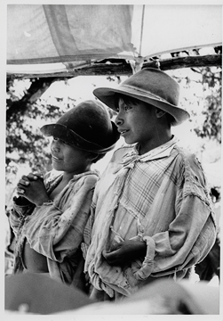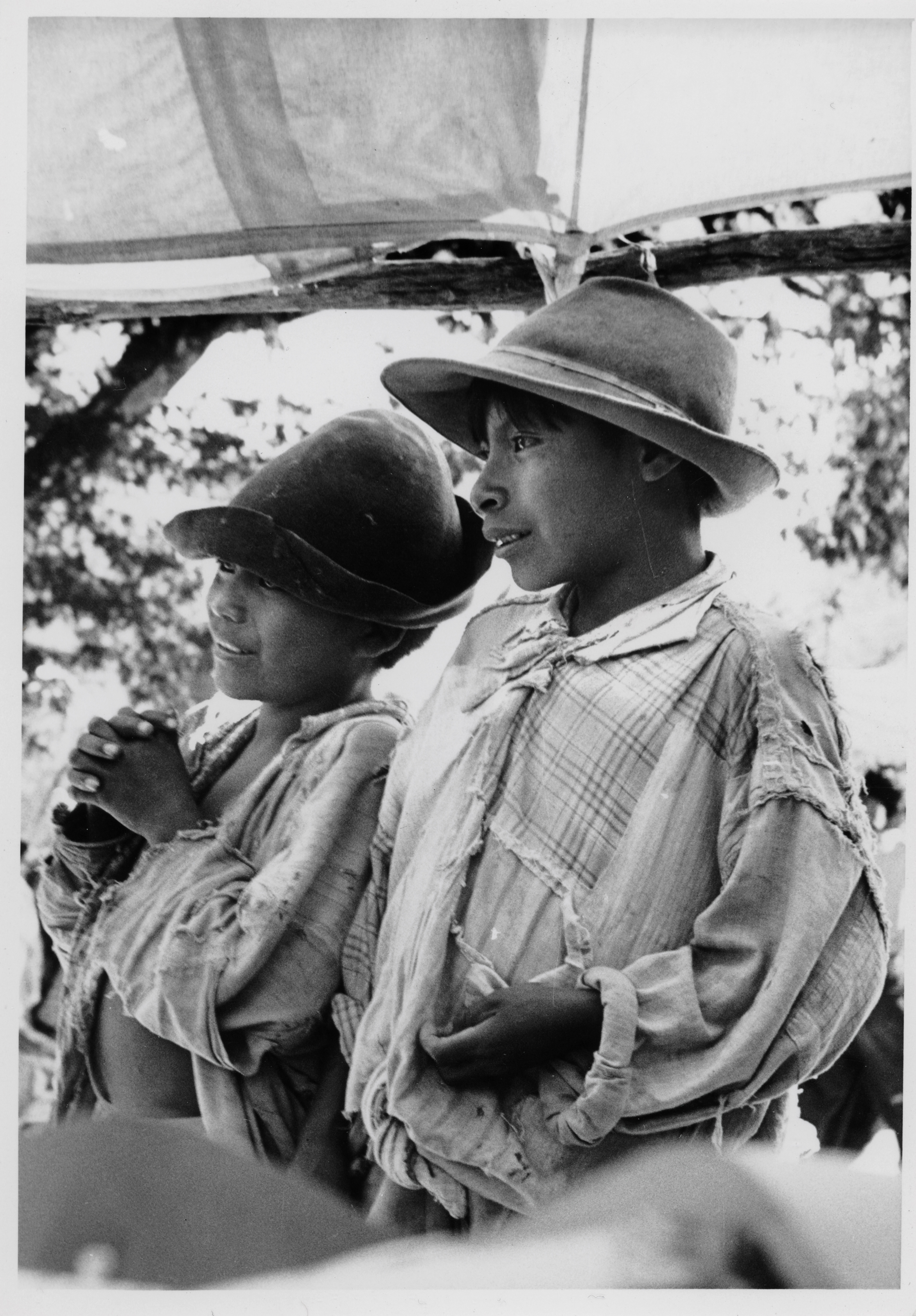 Niños Mixes en la feria de Santiago Ixcuintepec, Oaxaca. Los dos visten camisas hechas de remiendos de telas y sombreros de fieltro, popularmente conocidos como de "panza de burro".