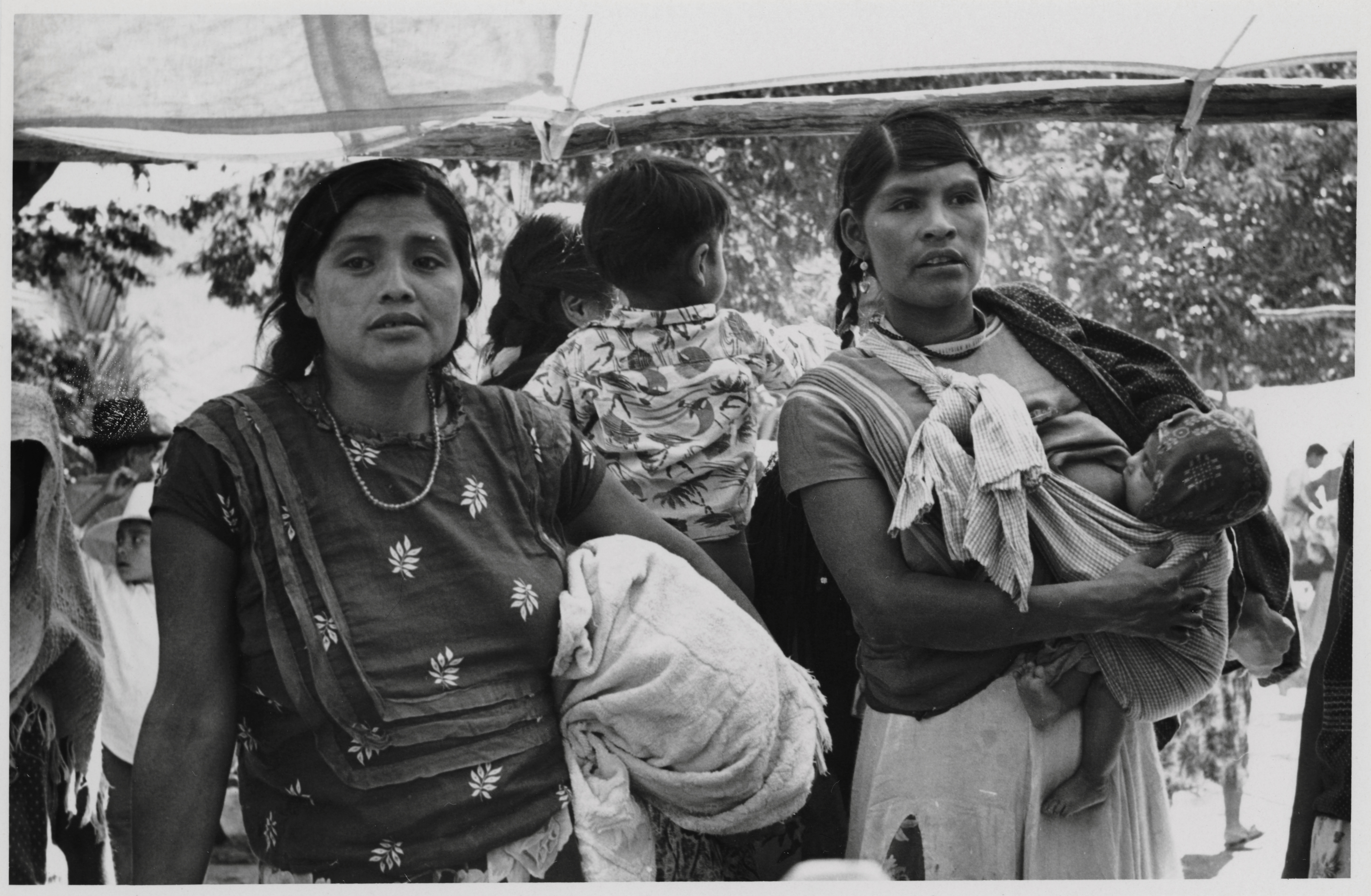 Las dos mujeres visten blusas con diseños propios de la zona del Istmo de Tehuantepec, sin embargo la autora de la imagen no está segura del origen de ellas. Complementan su indumentaria con collares de cuentas, la mujer de la derecha amamanta a su bebé, mientras lo sostiene con la ayuda de un lienzo, lo lleva anudado a la altura del pecho. En la feria de Ixcuintepec , Oaxaca.