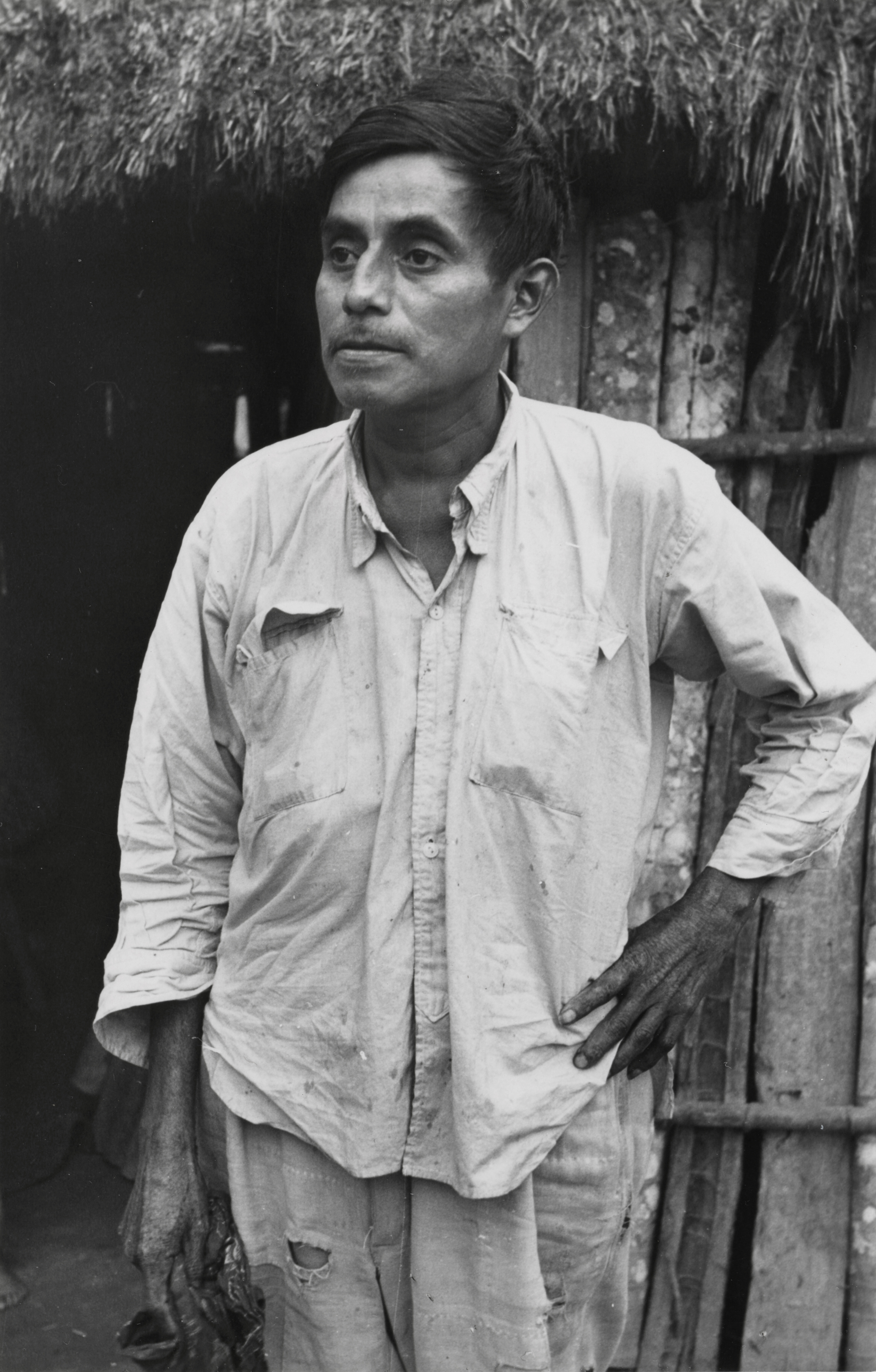 Francisco José, brujo de la comunidad de Mazatlán, Oaxaca. Proporcionó información acerca del calendario mixe y de los hongos (teonanácatl) a la autora. Viste ropa industrial y a su espalda una vivienda hecha de troncos de madera y techo de palma.