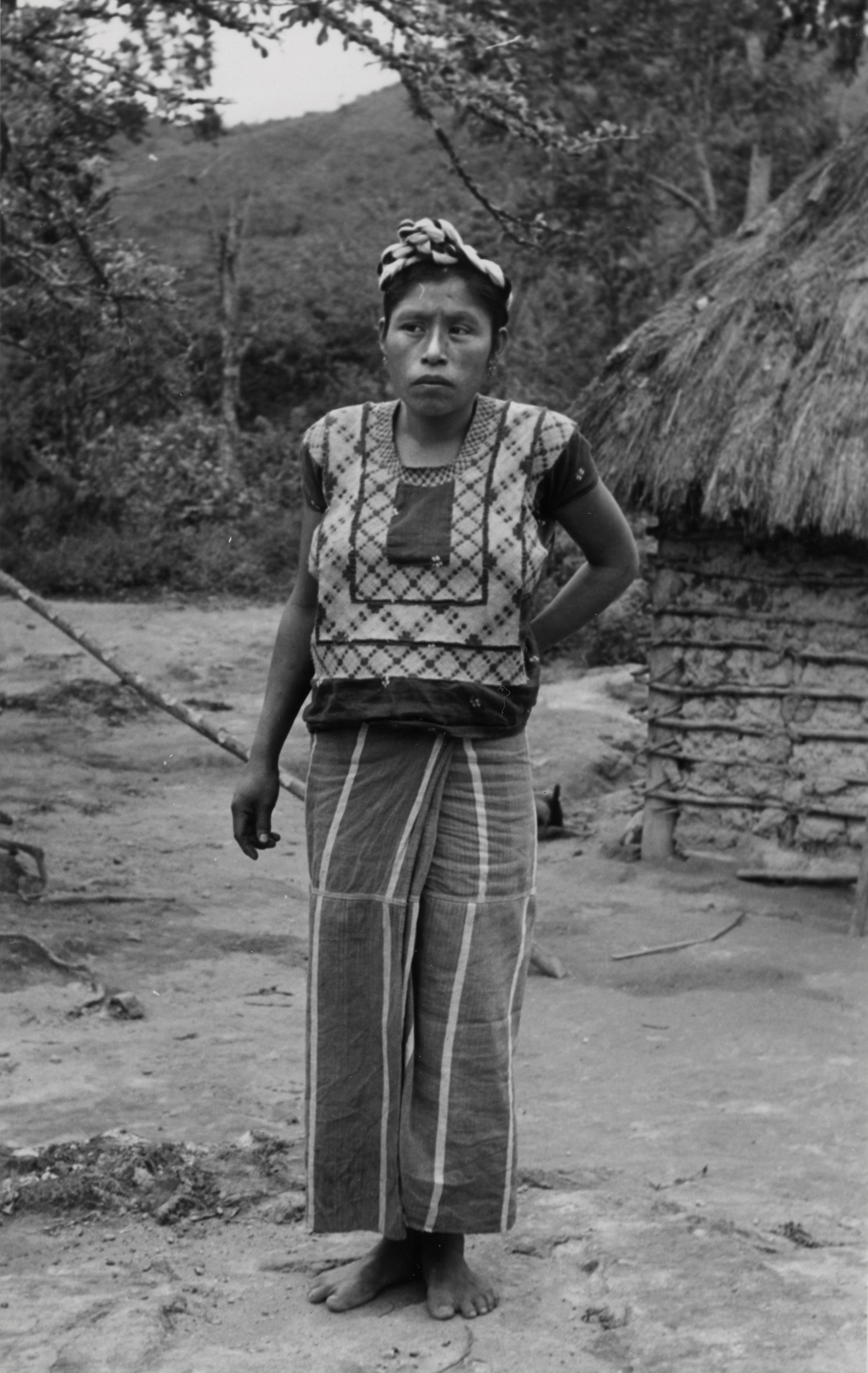 Mujer mixe de San Juan Guichicovi. Viste un huipil (blusa) corto con motivos geométricos bordados con máquina, este tipo de huipil es de las tehuanas del Istmo de tehuantepec. Lleva un enredo (falda), que generalmente es de color rojo y las franjas verticales de color amarillo. El cabello lo lleva adornado con listones, anudado a la coronilla de la cabeza, en forma de rodete. A espaldas de ella se aprecia la estructura de una vivienda, se compone de troncos de madera y las uniones están hechas con algún tipo de cuerda, el recubrimiento de la pared es de arcilla y el techo es de palma. En este tipo de arquitectura vernácula, no eran utilizados los clavos ni los tornillos.