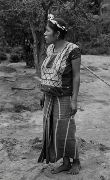 Mujer mixe de San Juan Guichicovi. Viste un huipil (blusa) corto con motivos geométricos bordados con máquina, este tipo de huipil es de las tehuanas del Istmo de Tehuantepec. Lleva un enredo (falda), de dos lienzos que generalmente son de color rojo y las franjas verticales de color amarillo. El cabello lo lleva adornado con listones, anudado a la cima de la cabeza, y está descalza.