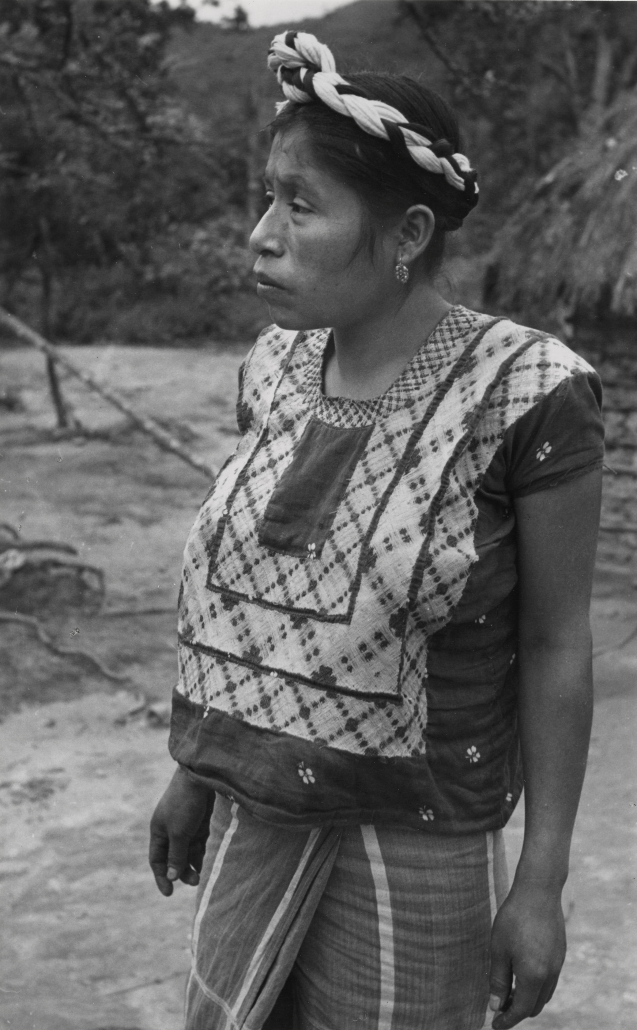 Mujer mixe de San Juan Guichicovi. Viste un huipil (blusa) corto con motivos geométricos bordados con máquina, este tipo de huipil es de las tehuanas del Istmo de tehuantepec. Lleva un enredo (falda), que generalmente es de color rojo y las franjas verticales de color amarillo. El cabello lo lleva adornado con listones, anudado a la cima de la cabeza.