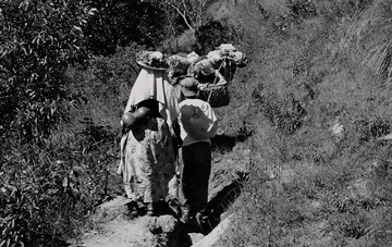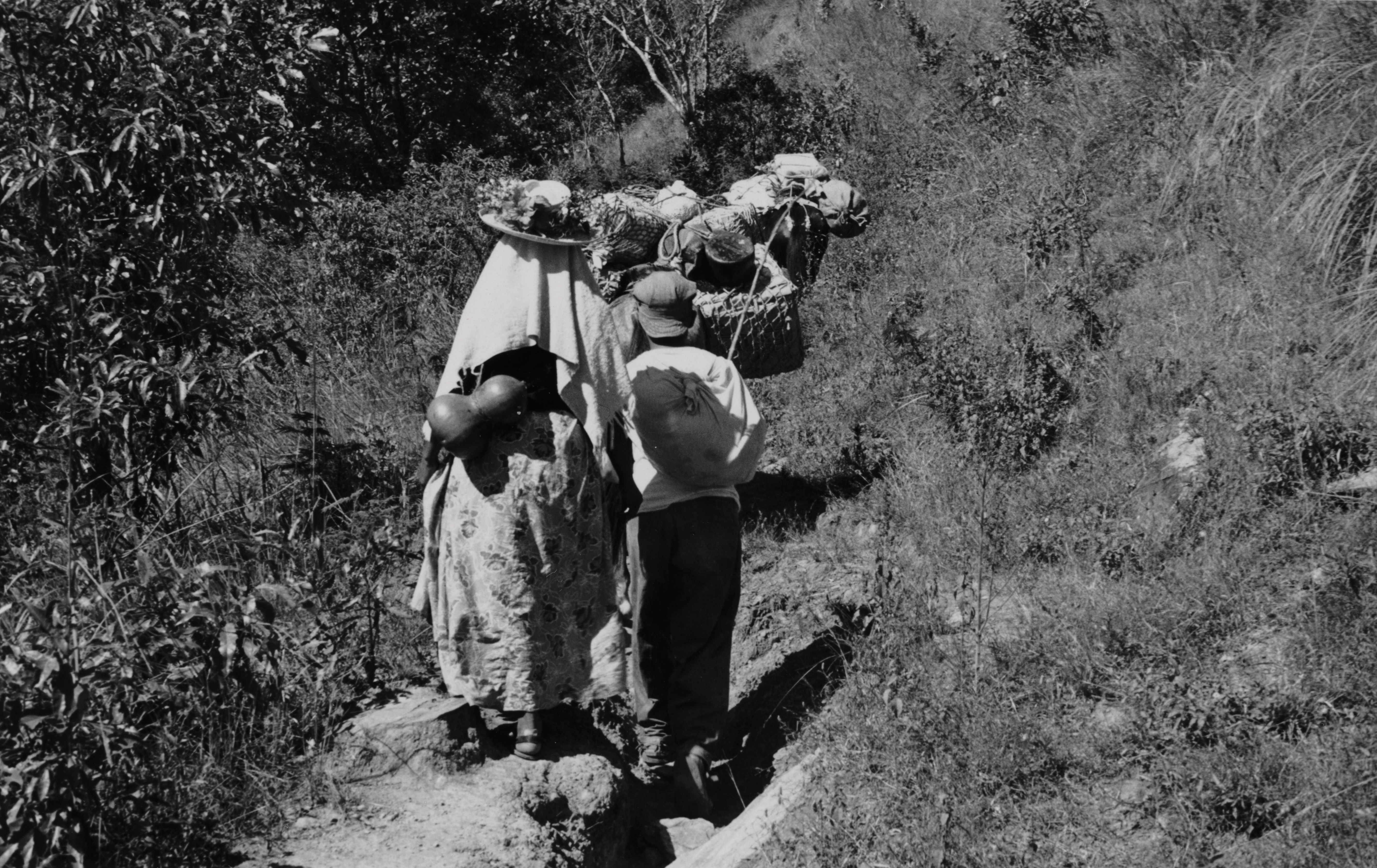 Kata caminando en la vereda que se encuentra entre Coatlán e Ixcuintepec, Oaxaca. Viste una falda de tela industrial y la toalla que lleva en la cabeza le cubre el huipil (blusa) de terciopelo, lleva un sombrero adornado con flores y carga un bule. Adelante de ella va un hombre vistiendo ropa de manufactura industrial, lleva una cachucha en la cabeza, y en la espalda carga algo que va envuelto en un lienzo. Más adelante de ellos unas bestias de carga.