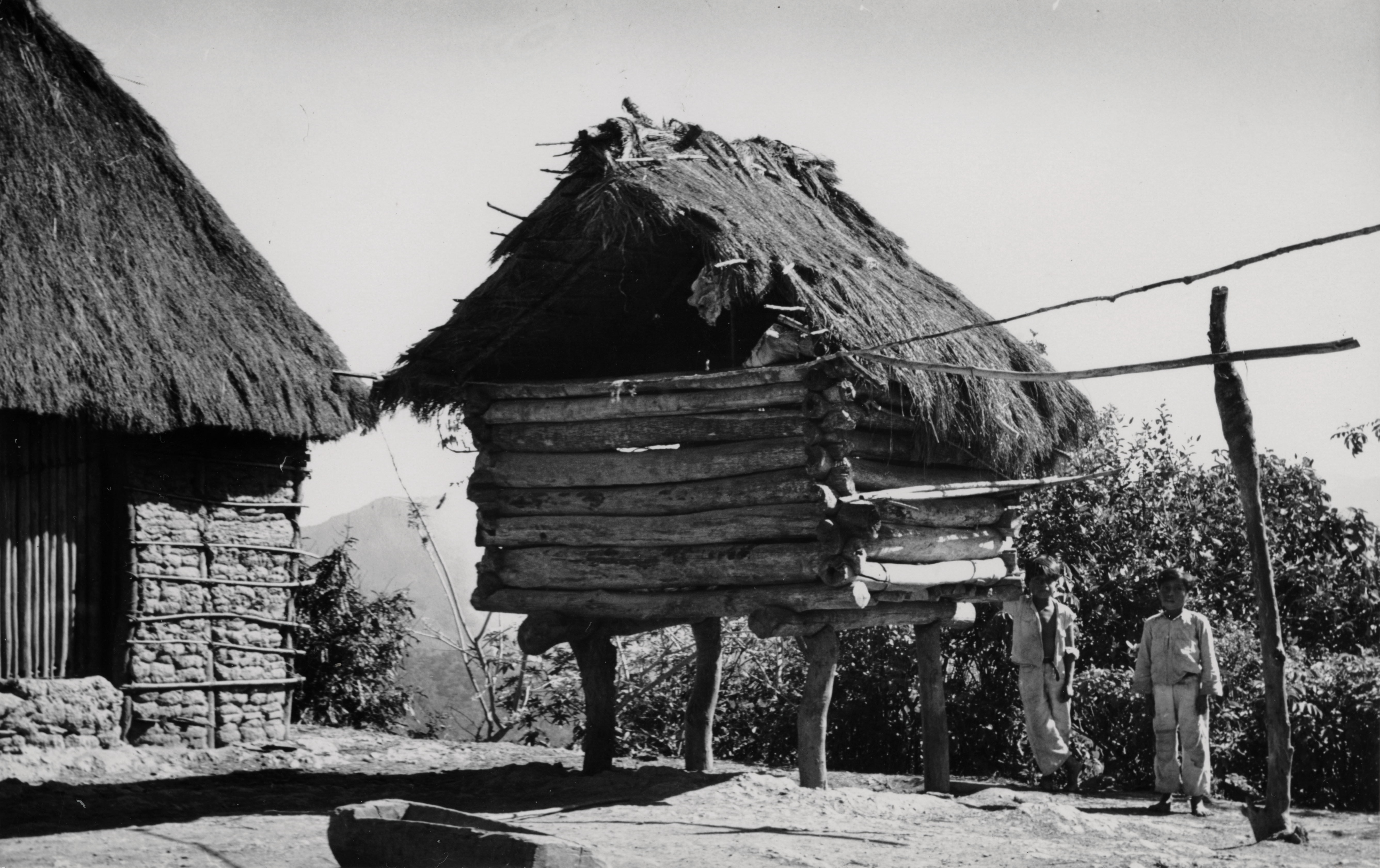 Granero=tse'x (mixe de Totontepec). Eran edificados en alto para proteger los granos que allí se guardaban, de los animales, su estructura a base de troncos de árboles y con techos de palma. A un lado se puede observar parte de una vivienda, la pared tiene una estructura de troncos y está revestida con tierra, el techo es de palma, en este tipo de arquitectura vernácula, no se utilizaban clavos ni tornillos. Dos niños observan atentos a la cámara.