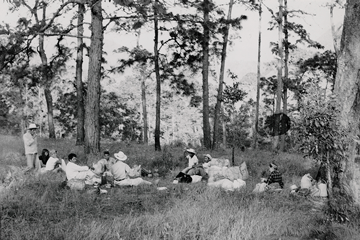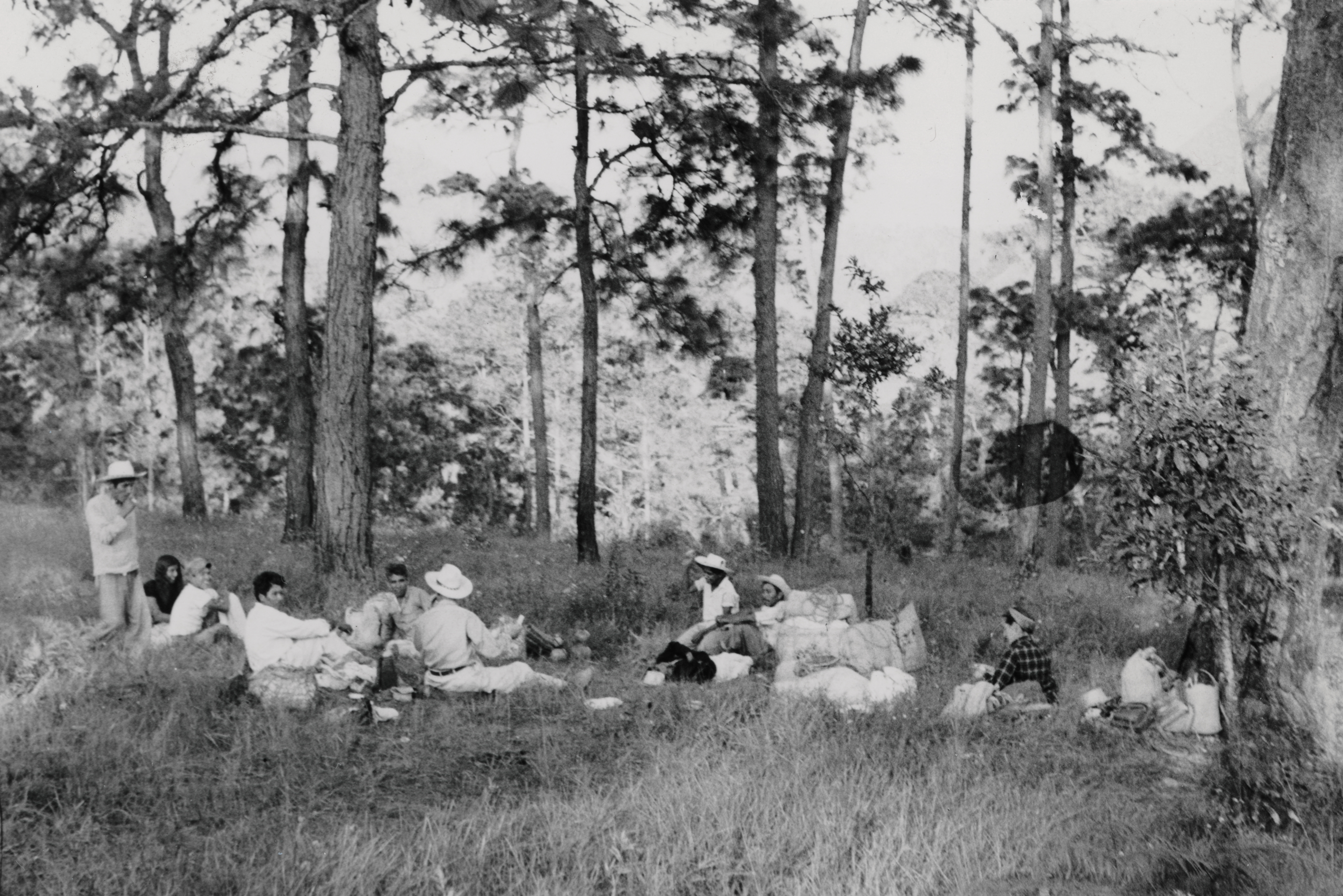 Tomando un descanso en el campo, entre Lachiguiri y Coatlán, Oax. En el extremo derecho de la imagen se puede observar sentada a Irmgard, viste una blusa a cuadros y lleva una pañoleta en la cabeza, y en el extremo izquierdo sentada con su huipil (blusa) de terciopelo y el cabello suelto está Kata. La comitiva compuesta en su mayoría por hombres. Se aprecia todo el equipaje que llevan consigo, el cual está dispuesto en el suelo.