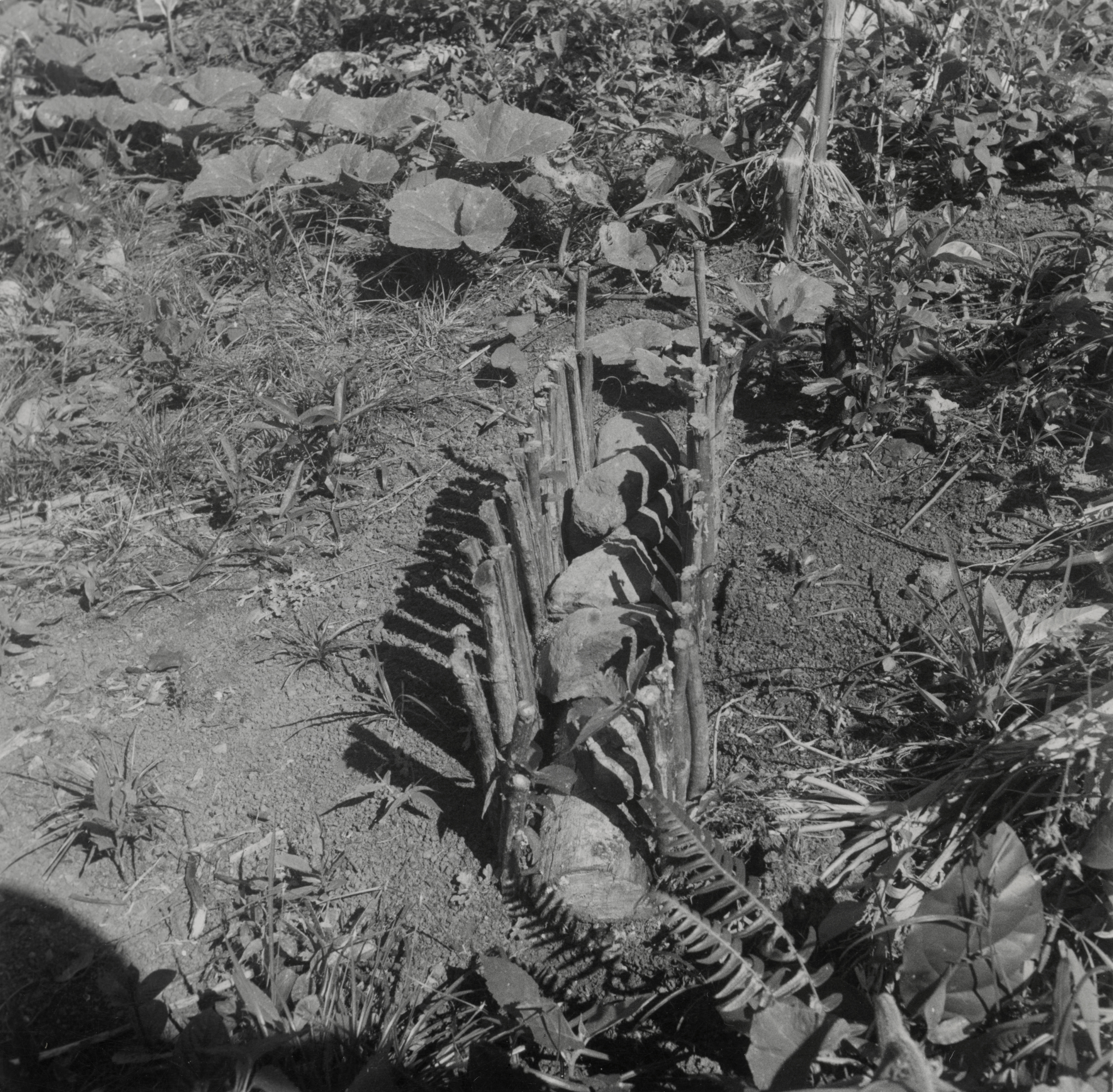 Imagen tomada por Don Tomás. Santuario en la milpa, en Arroyo del Chile. Elaborado con troncos de madera enterradas en el suelo que sirven como cerca y un cama de piedras al centro, de forma rectangular. Este arroyo de acuerdo a la autora es el último antes de comenzar la subida rumbo a Ixcuintepec, Oaxaca.