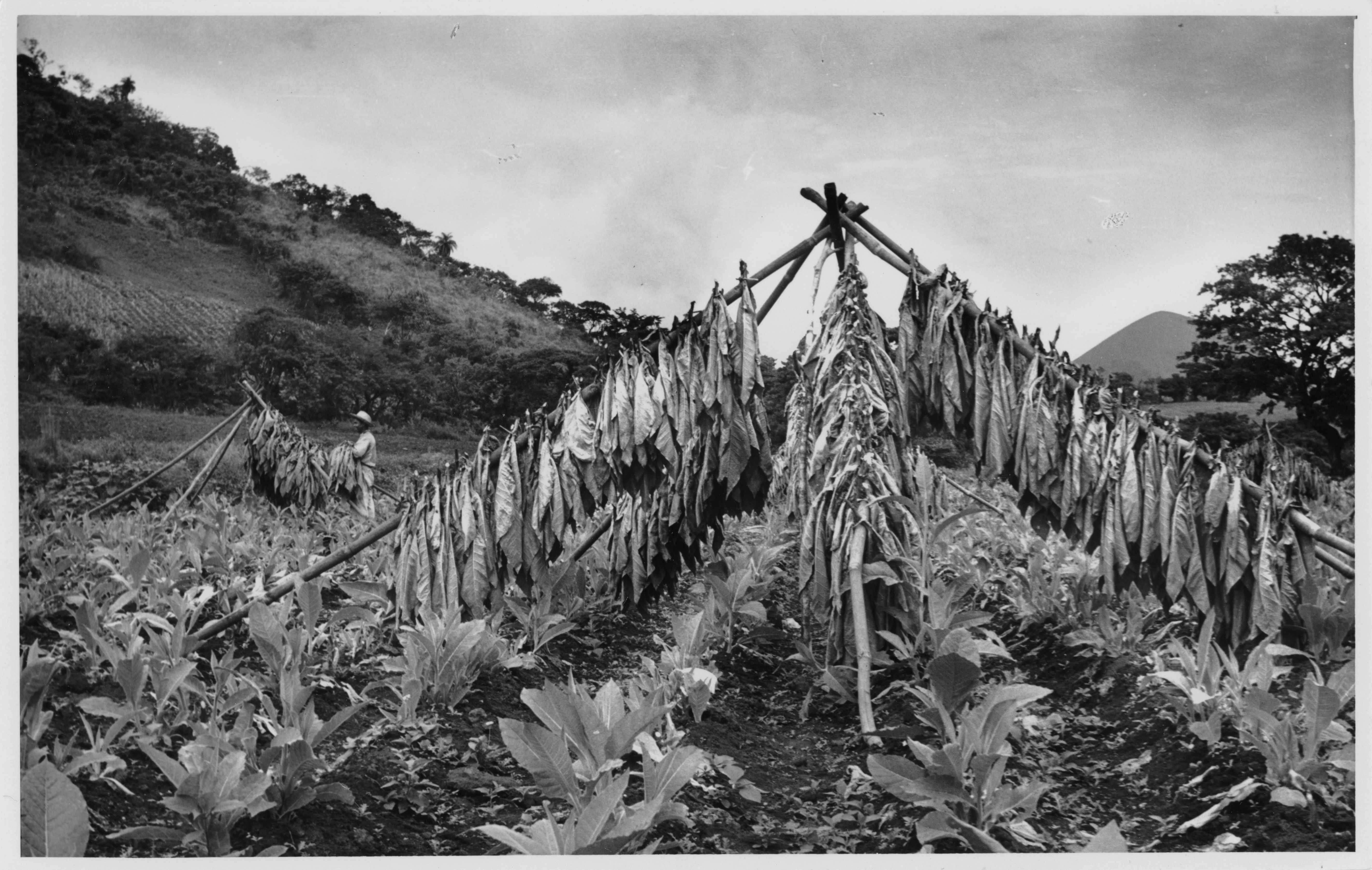 Plantío de tabaco y en medio de este, una estructura de forma piramidal hecha de troncos de madera, con manojos de hojas de tabaco para su secado, del lado izquierdo, un campesino de pie sostiene en su brazo izquierdo varios manojos de hojas de tabaco.