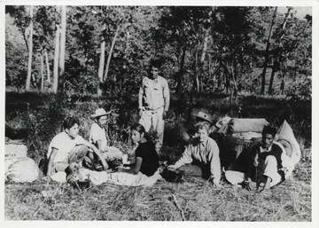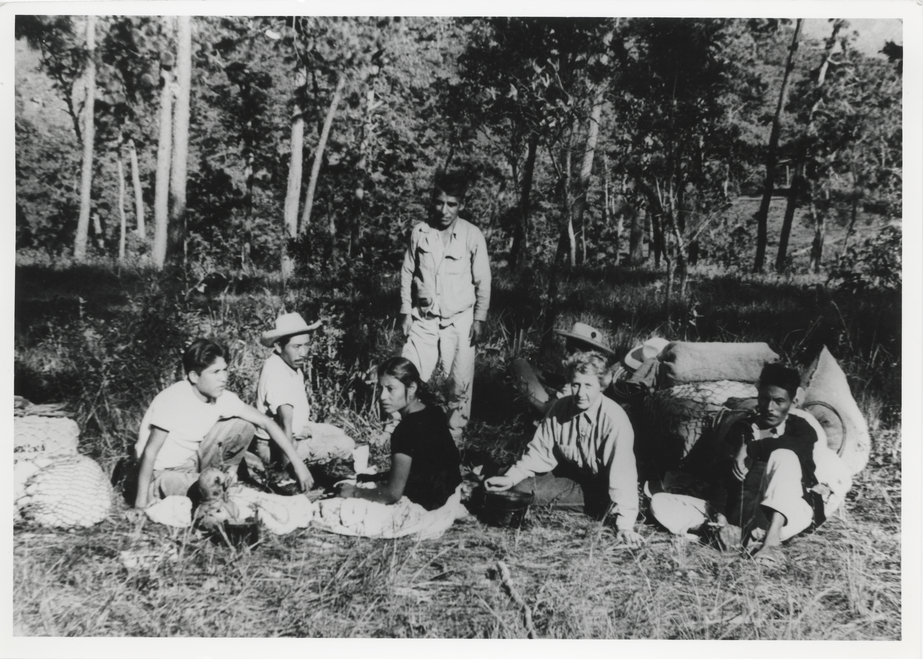 Tomando un descanso en Agua Zarca, entre Lachiguiri y Coatlán, Oax. Al centro del semicírculo formado por los hombres, se encuentran dos mujeres sentadas, del lado derecho viendo la cámara vistiendo una blusa de manga larga Bodil Christensen, del lado izquierdo vistiendo un huipil (blusa) corto de terciopelo y el cabello suelto está Kata. La comitiva compuesta en su mayoría por hombres, en dirección a Ixcuintepec.