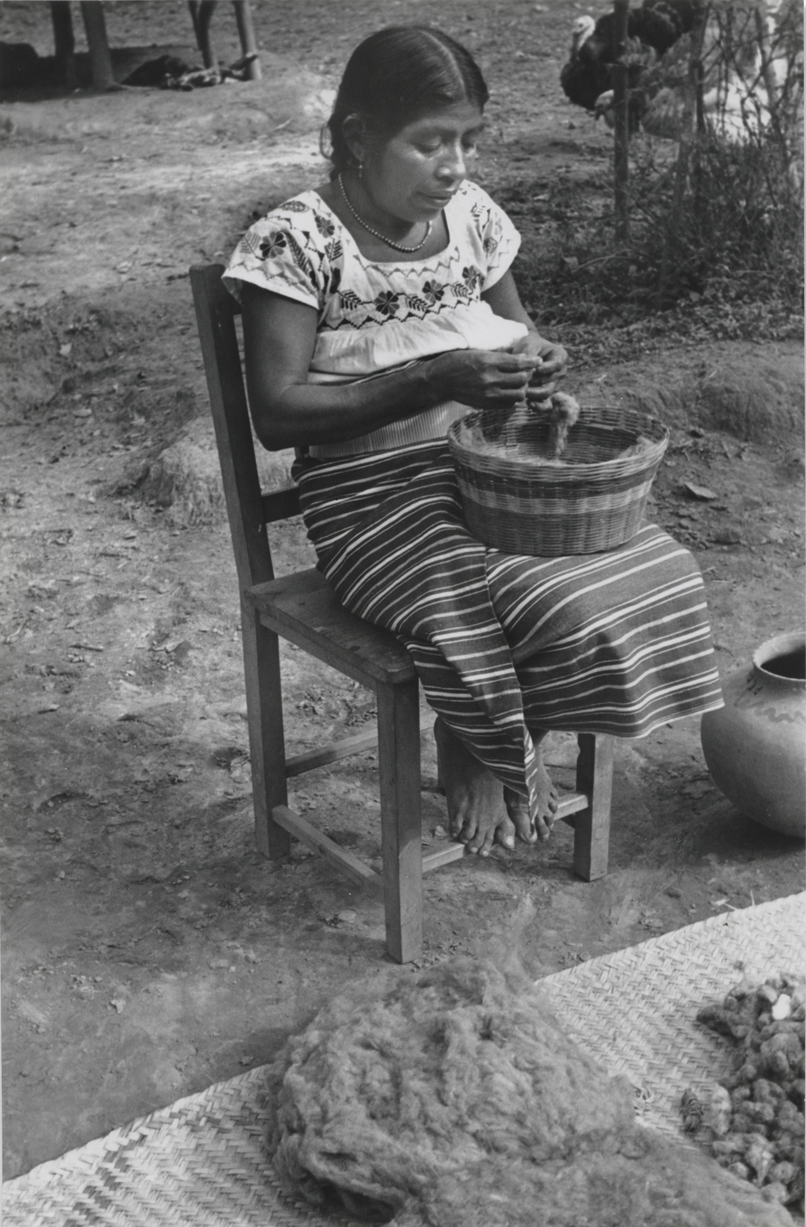Mujer nahua despepitando la fibra de algodón café, ella está sentada en una silla de madera y en su regazo tiene un canasto hecho de carrizo, donde realiza el despepitado, viste una blusa de manga corta que tiene bordados motivos geométricos y de flores, el refajo (falda) se sostiene en la cintura mediante una tiesa cinta acanalada de manufactura local de tejido complicado y que, muchas veces, se adornan con figuras geométricas y de animales. frente a ella un petate extendido, el cual tiene encima la fibra de algodón, a la derecha de la imagen se observa una olla de cerámica y a su espalda unos guajolotes.