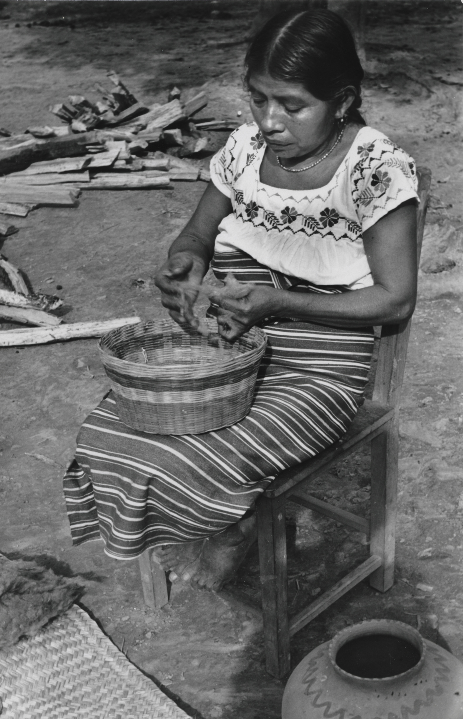 Mujer nahua despepitando la fibra de algodón café, ella está sentada en una silla de madera y en su regazo tiene un canasto hecho de carrizo, donde realiza el despepitado, viste una blusa de manga corta la cual tiene bordados motivos geométricos y florales, el refajo (falda) se sostiene en la cintura mediante una tiesa cinta acanalada de manufactura local de tejido complicado y que, muchas veces, se adornan con figuras geométricas y de animales. Complementa su indumentaria con un collar de cuentas, aretes y lleva el cabello recogido, frente a ella, sobre un petate extendido, la fibra de algodón, a la derecha de la imagen se observa una olla de cerámica y a la izquierda pedazos de troncos de madera. La fotografía fue tomada en la comunidad de Cosoleacaque, Veracruz en diciembre de 1953.Author