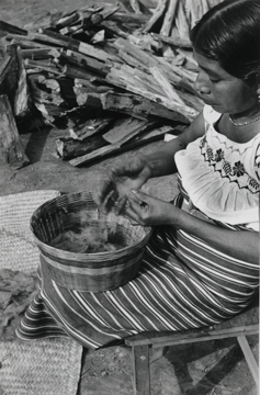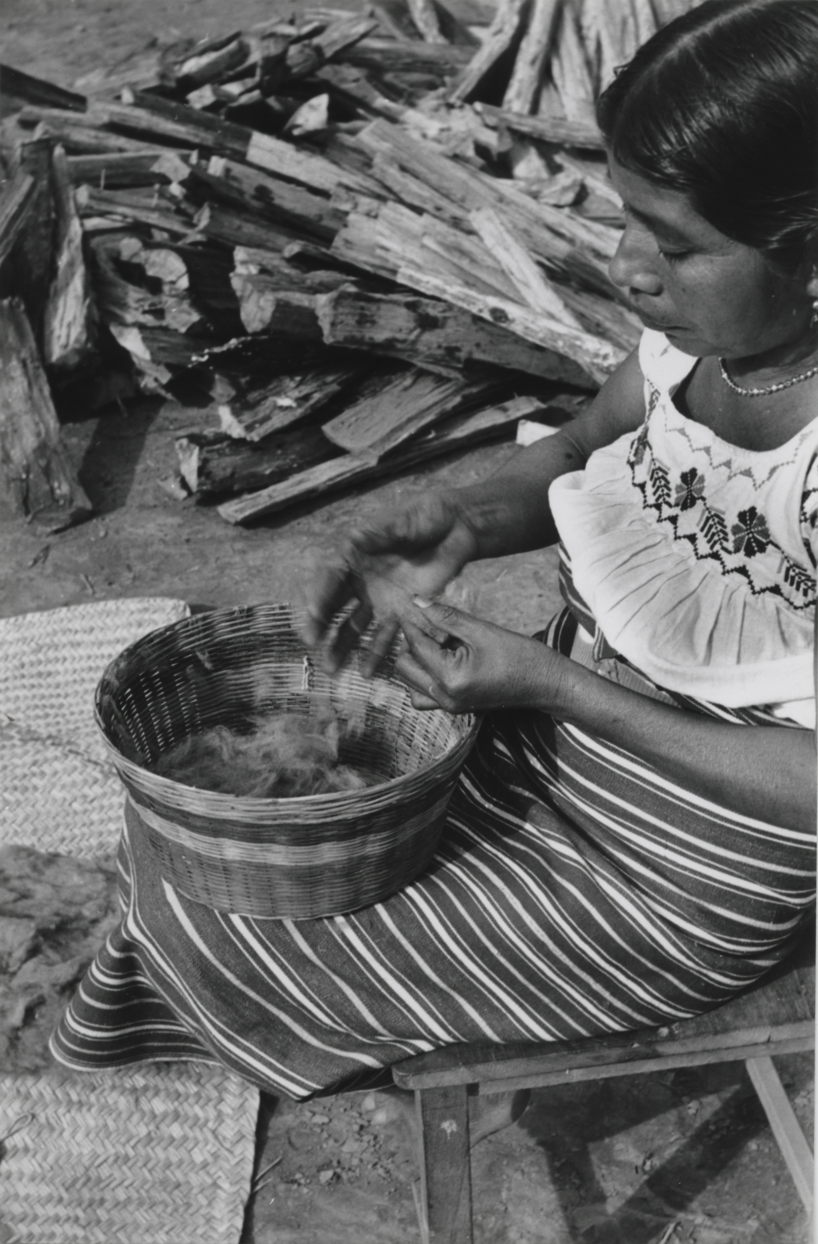 Mujer nahua despepitando la fibra de algodón café, ella está sentada en una silla de madera y en su regazo tiene un canasto hecho de carrizo, donde realiza la actividad, viste una blusa de manga corta la cual tiene bordados motivos geométricos y florales, el refajo (falda) enrollado, y tejido en telar de cintura con rayas amarillas, rojas, negras y blancas se sostiene en la cintura mediante una tiesa cinta acanalada de manufactura local de tejido complicado y que, muchas veces, se adornan con figuras geométricas y de animales. Complementa su indumentaria con un collar de cuentas, aretes y lleva el cabello recogido, frente a ella, sobre un petate extendido, la fibra de algodón, a la izquierda y al fondo de la imagen, pedazos de troncos de madera. La fotografía fue tomada en la comunidad de Cosoleacaque, Veracruz en diciembre de 1953.Author