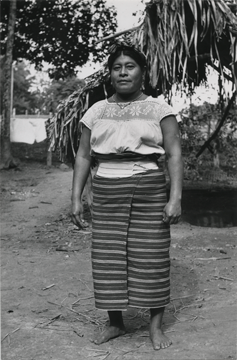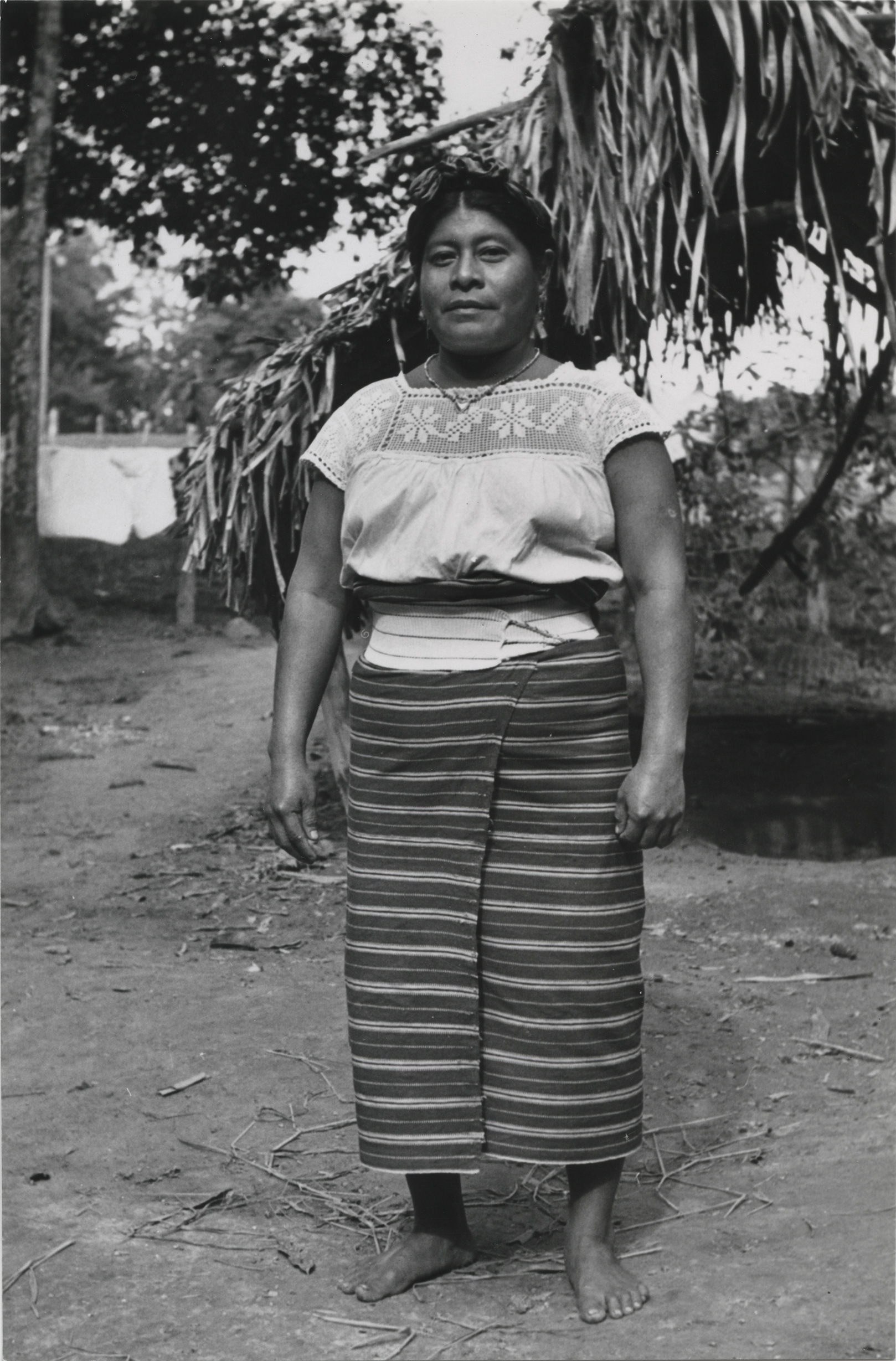 Mujer nahua de Cosoleacaque, Veracruz. Viste un enredo (falda) tejido en telar de cintura con un diseño de líneas de diversos colores y está sostenido a la cintura por una faja acanalada, la cual tiene también diseños de líneas, la blusa se compone de varias piezas y está deshilada, alrededor del cuello y en las mangas, con diseños de guias de flores. Complementa su indumentaria con un collar, aretes y lleva el cabello arreglado en dos trenzas, las cuales están entrelazadas con listones que se cruzan por la nuca y se pasan alrededor de la cabeza, hacia adelante donde se anudan formando un moño. Ella está descalza.