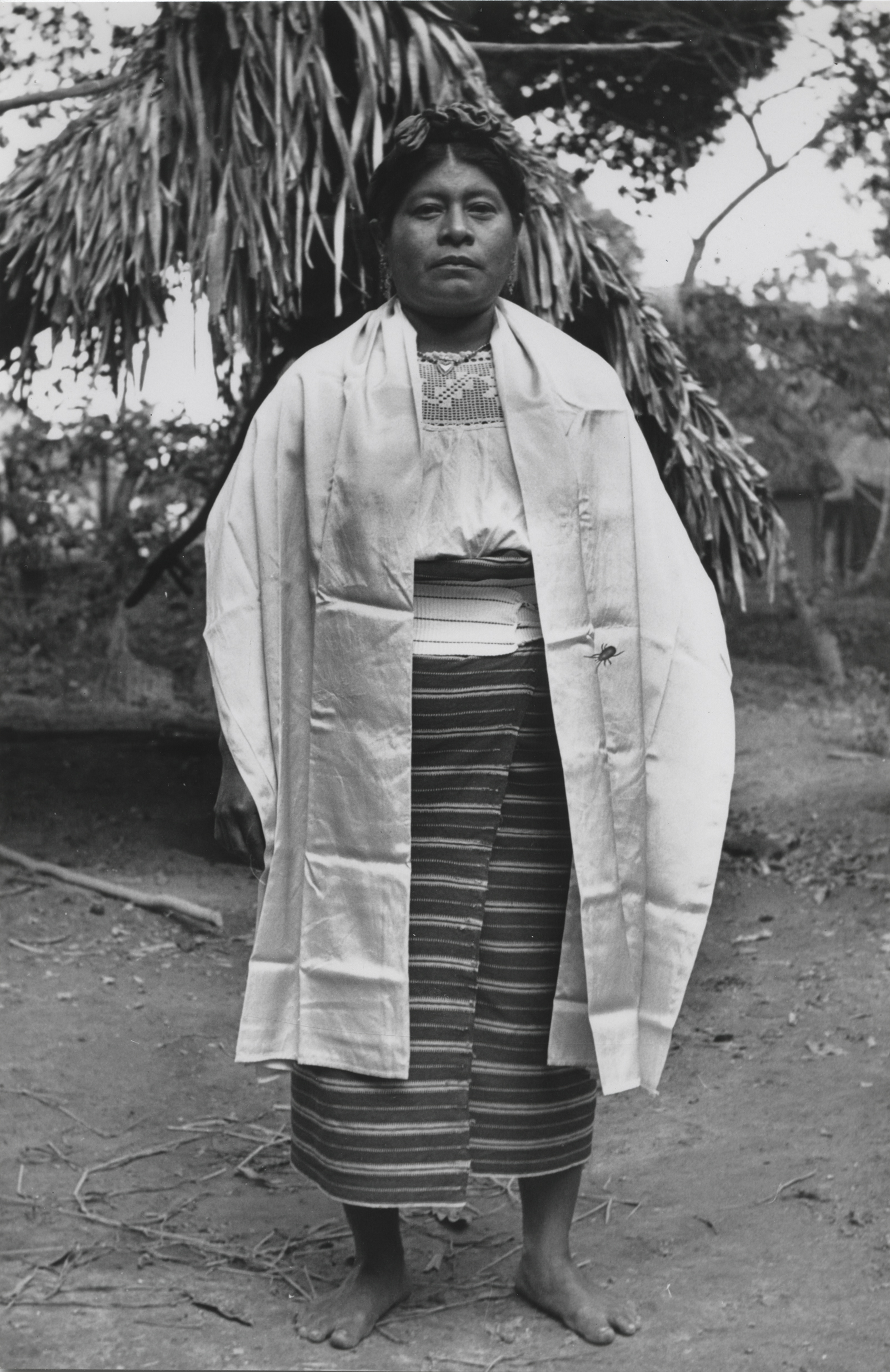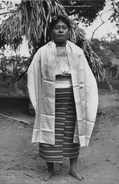 Mujer nahua de Cosoleacaque, Veracruz. Viste un enredo (falda) tejido en telar de cintura con un diseño de líneas en forma horizontal y está sostenido a la cintura por una faja de textura acanalada, la cual tiene también diseños de líneas, la blusa se compone de varias piezas y tiene motivos florales. Complementa su indumentaria con un collar de cuentas, aretes de "canastita" y lleva el cabello arreglado en dos trenzas, las cuales están entrelazadas con listones que se cruzan por la nuca y se pasan alrededor de la cabeza, hacia adelante donde se anudan formando un moño. Un rebozo de tela comercial le cubre los hombros y cuelgan los extremos a ambos lados. Ella está descalza.