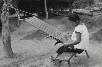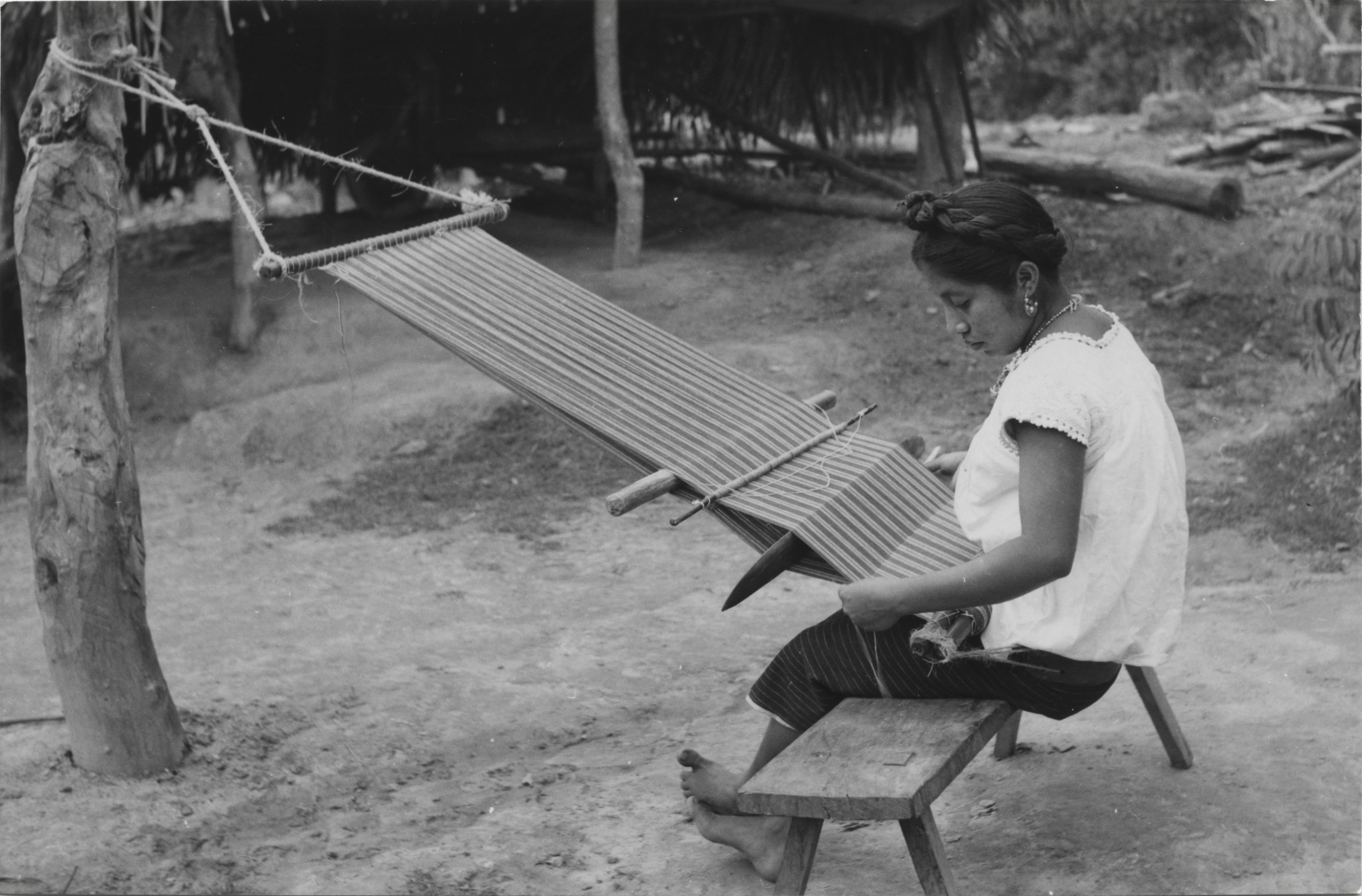 Mujer nahua sentada en un banco de madera, tejiendo en telar de cintura un lienzo para enredo (falda), el machete está en posición vertical para hacer el espacio en los hilos de urdimbre para introducir la bobina o lanzadera, la cual tiene enrollado el hilo. El enjulio superior se encuentra atado a un tronco de árbol con un mecate y en el otro extremo tiene dos enjulios, uno de estos le sirve para enrollar parte del lienzo terminado, y el otro está atado a la cintura de la tejedora por medio de un mecapal. Ella viste un enredo (falda) y una blusa con motivos de guías alrededor del cuello, complementa su indumentaria con un collar de cuentas y aretes, lleva el cabello trenzado, que se cruza por la nuca y se pasa alrededor de la cabeza, hacia adelante donde se anuda. Está descalza.Author