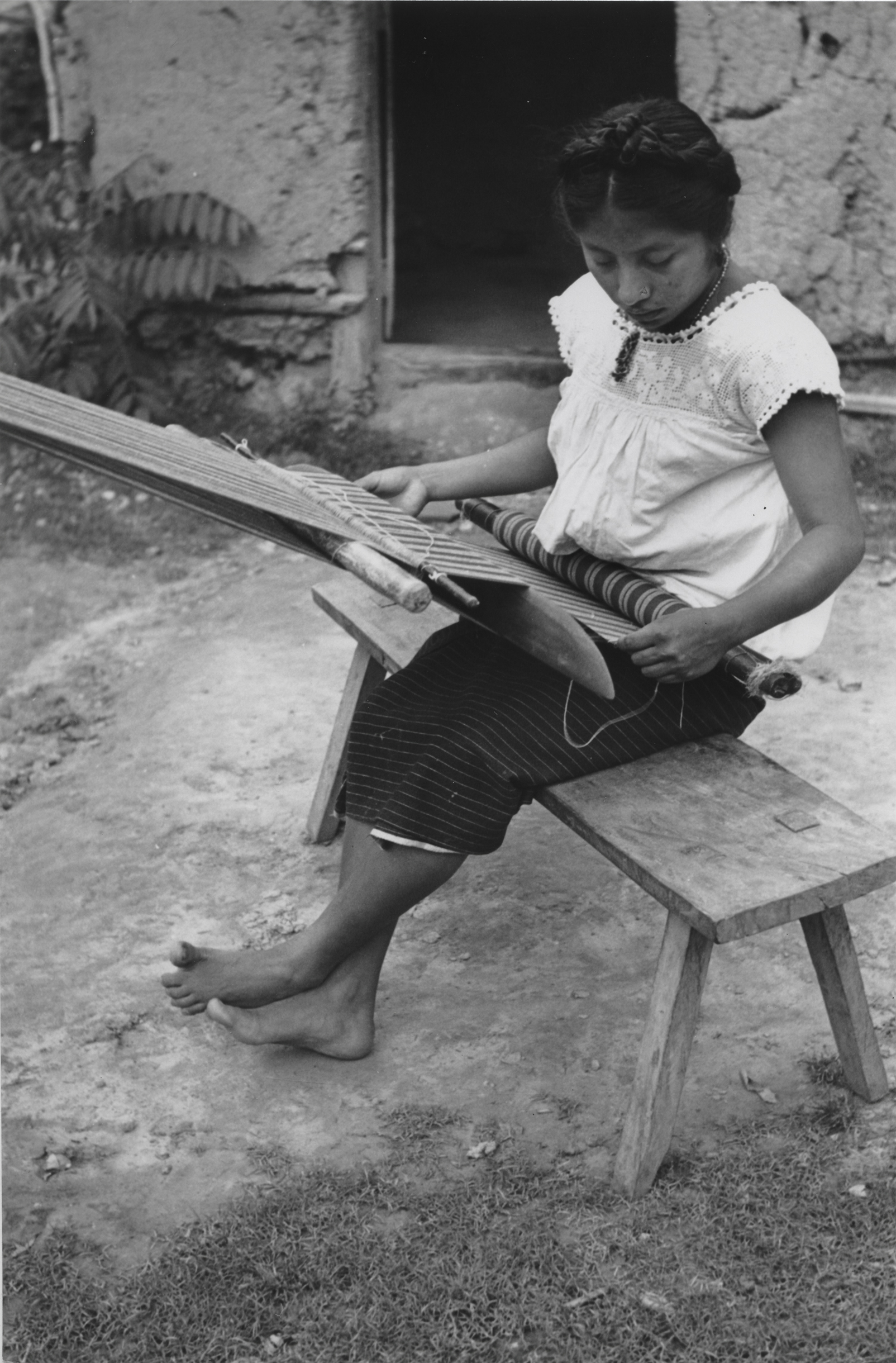 Mujer nahua sentada en un banco de madera, tejiendo en telar de cintura un lienzo para enredo (falda), el machete está en posición vertical para hacer el espacio en los hilos de urdimbre, y poder introducir la bobina o lanzadera, la cual tiene enrollado el hilo. El enjulio superior se encuentra atado a un tronco de árbol con un mecate y en el otro extremo tiene dos enjulios, uno de estos le sirve para enrollar parte del lienzo terminado, y el otro está atado a la cintura de la tejedora por medio de un mecapal. Ella viste un enredo (falda) y una blusa con motivos de guías alrededor del cuello, complementa su indumentaria con un collar de cuentas y aretes, lleva el cabello trenzado, que se cruza por la nuca y se pasa alrededor de la cabeza, hacia adelante donde se anuda. Está descalza.Author