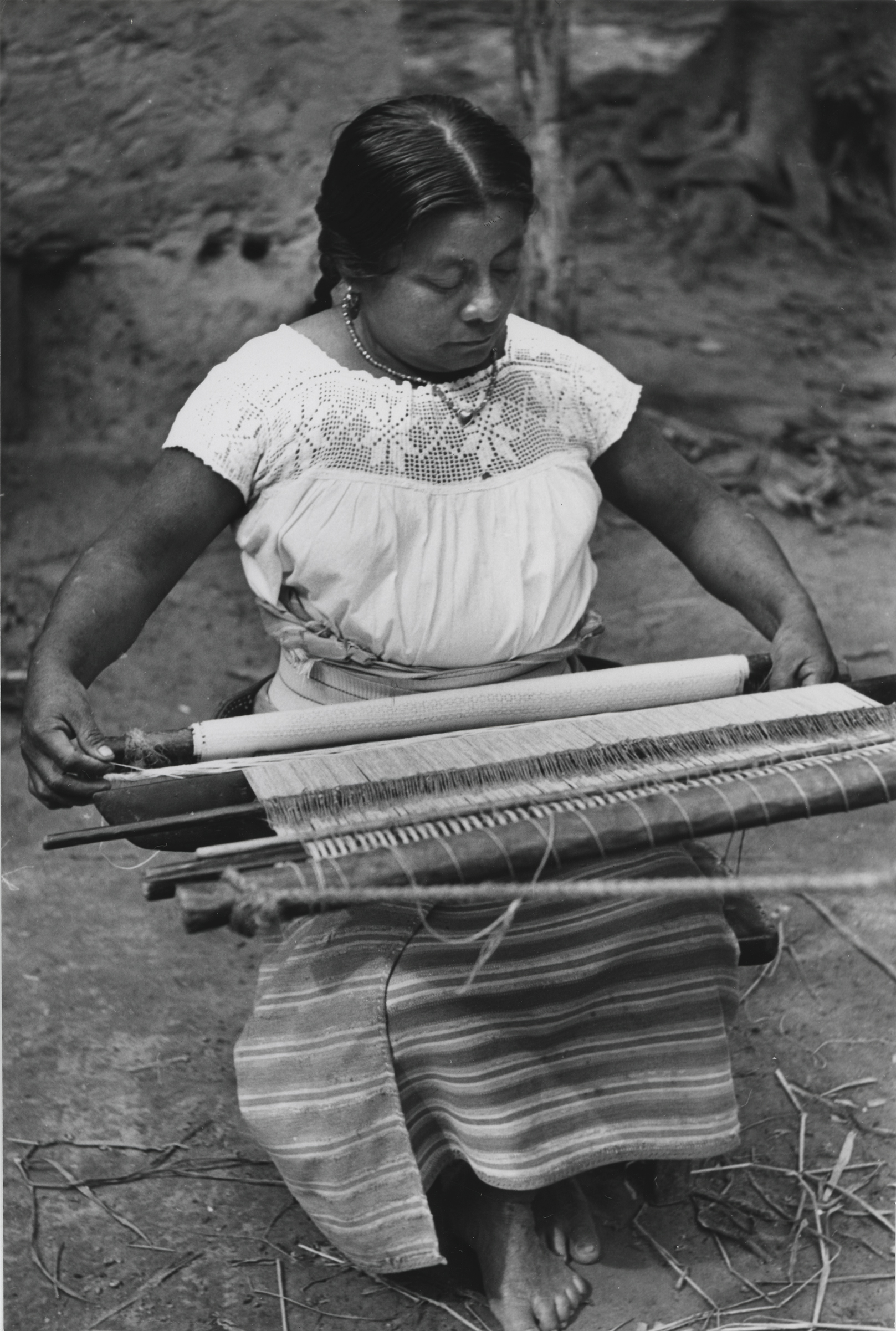Mujer nahua sentada en un banco de madera, tejiendo una servilleta en telar de cintura. Pasa el hilo de trama en el espacio que hay entre los hilos de urdimbre, y que mantiene con el machete en posición vertical. Ella viste un enredo (falda), el cual se compone de dos lienzos unidos verticalmente, se encuentra sostenido a la cintura por una faja con textura acanalada con diseños de líneas verticales, que al ser puesta se ven en forma horizontal. Lleva una blusa, la cual está metida en el enredo (falda), esta se compone de varias piezas, y al contorno del cuello tiene motivos de guias de flores. Complementa su indumentaria con un collar de cuentas, el cual tiene un pendiente en forma de corazón, tiene aretes y lleva el cabello recogido en dos trenzas y está descalza.Author