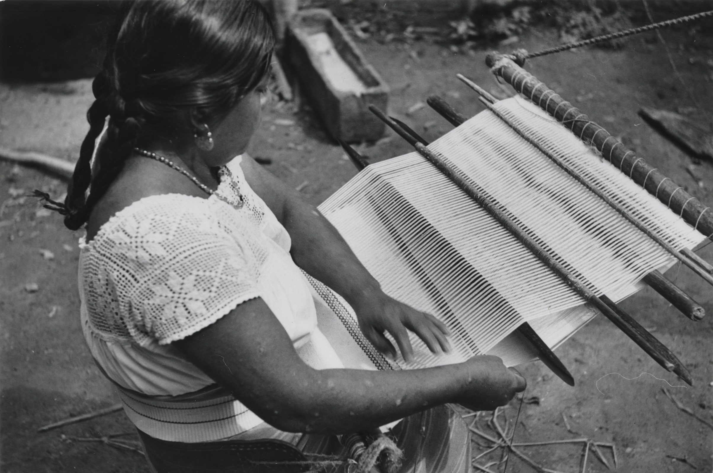 Mujer nahua sentada, tejiendo una servilleta en telar de cintura. En esta imagen se aprecian todos los elementos utilizados en el telar de cintura, el enjulio superior sujeto por unos mecates, le sigue una vara de paso, luego una vara de lizo, una segunda vara de paso, un machete, una segunda vara de lizo, un segundo machete de mayor dimensión que el primero, ella sostiene con la mano derecha una bobina o lanzadera con hilo de color para la trama y los enjulios inferiores, los cuales están sujetos a la cintura de la tejedora por un mecapal. Ella viste un enredo (falda), el cual se compone de dos lienzos unidos verticalmente, se encuentra sostenido a la cintura por una faja con textura acanalada con diseños de líneas verticales, que al ser puesta se ven en forma horizontal. Lleva una blusa, la cual está metida en el enredo (falda), esta se compone de varias piezas, y al contorno del cuello tiene motivos de guías de flores. Complementa su indumentaria con un collar de cuentas, aretes de "canastita" y lleva el cabello recogido en dos trenzas.Author