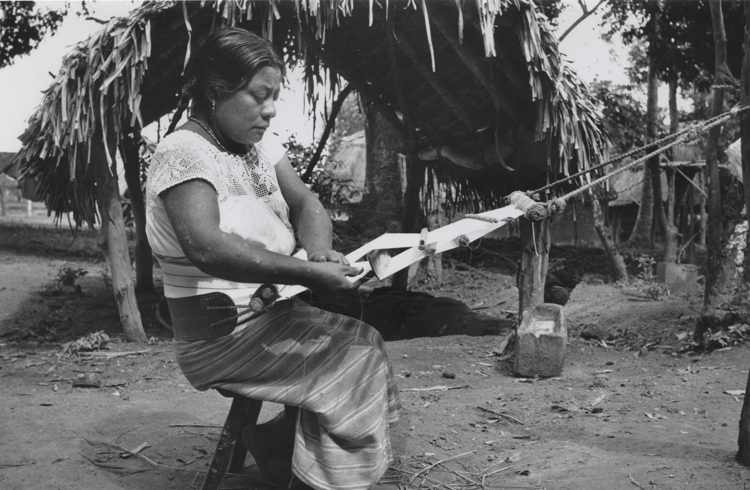 Mujer nahua sentada en un banco de madera, tejiendo una servilleta en telar de cintura. El machete lo tiene puesto en posición vertical, creando un espacio en los hilos de urdimbre para pasar la lanzadera, la cual tiene el hilo enrollado para pasar las hiladas de trama. Ella viste un enredo (falda), el cual se compone de dos lienzos unidos verticalmente, este se encuentra sostenido a la cintura por una faja con textura acanalada con diseños de líneas verticales, que al ser puesta se ven en forma horizontal. Lleva una blusa, la cual está metida en el enredo (falda), esta se compone de varias piezas, al contorno del cuello tiene motivos de guías de flores. Complementa su indumentaria con un collar de cuentas, el cual tiene un pendiente en forma de corazón, aretes de "canastita", lleva el cabello recogido en dos trenzas y está descalza.Author