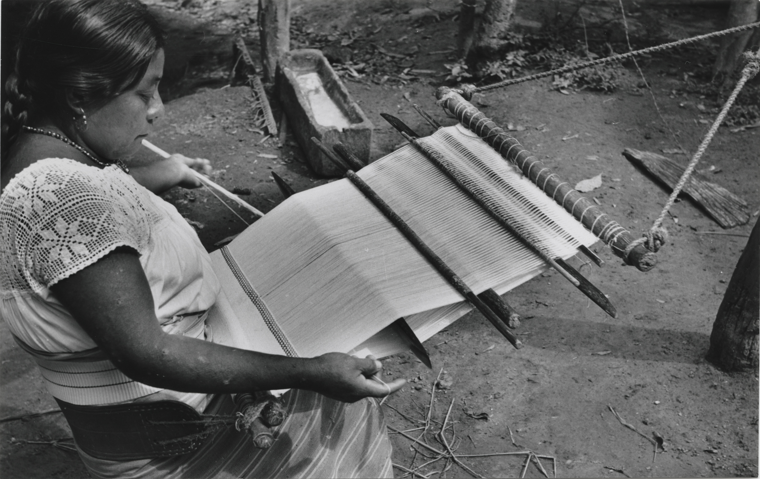 Mujer nahua tejiendo una servilleta en telar de cintura. Sostiene en la mano izquierda la lanzadera, la cual tiene enrollado el hilo que utiliza para pasar las hiladas de trama, en la mano derecha sostiene el otro extremo del hilo de trama. En esta imagen se aprecian todos los elementos que componen este telar de cintura. Tres enjulios, uno atado con una cuerda a un tronco y dos más atados a la cintura de la tejedora con la ayuda de un mecapal, uno de ellos le ayuda a enrollar parte del lienzo tejido, dos machetes de diferentes dimensiones, dos varas de paso y dos varas de lizo. Ella viste un enredo (falda), el cual se compone de dos lienzos unidos verticalmente, este se encuentra sostenido a la cintura por una faja con textura acanalada con diseños de líneas verticales, que al ser puesta se ven en forma horizontal. Lleva una blusa, la cual está metida en el enredo (falda), esta se compone de varias piezas, al contorno del cuello tiene motivos de guías de flores. Complementa su indumentaria con un collar de cuentas, aretes de "canastita" y lleva el cabello recogido en dos trenzas.Author