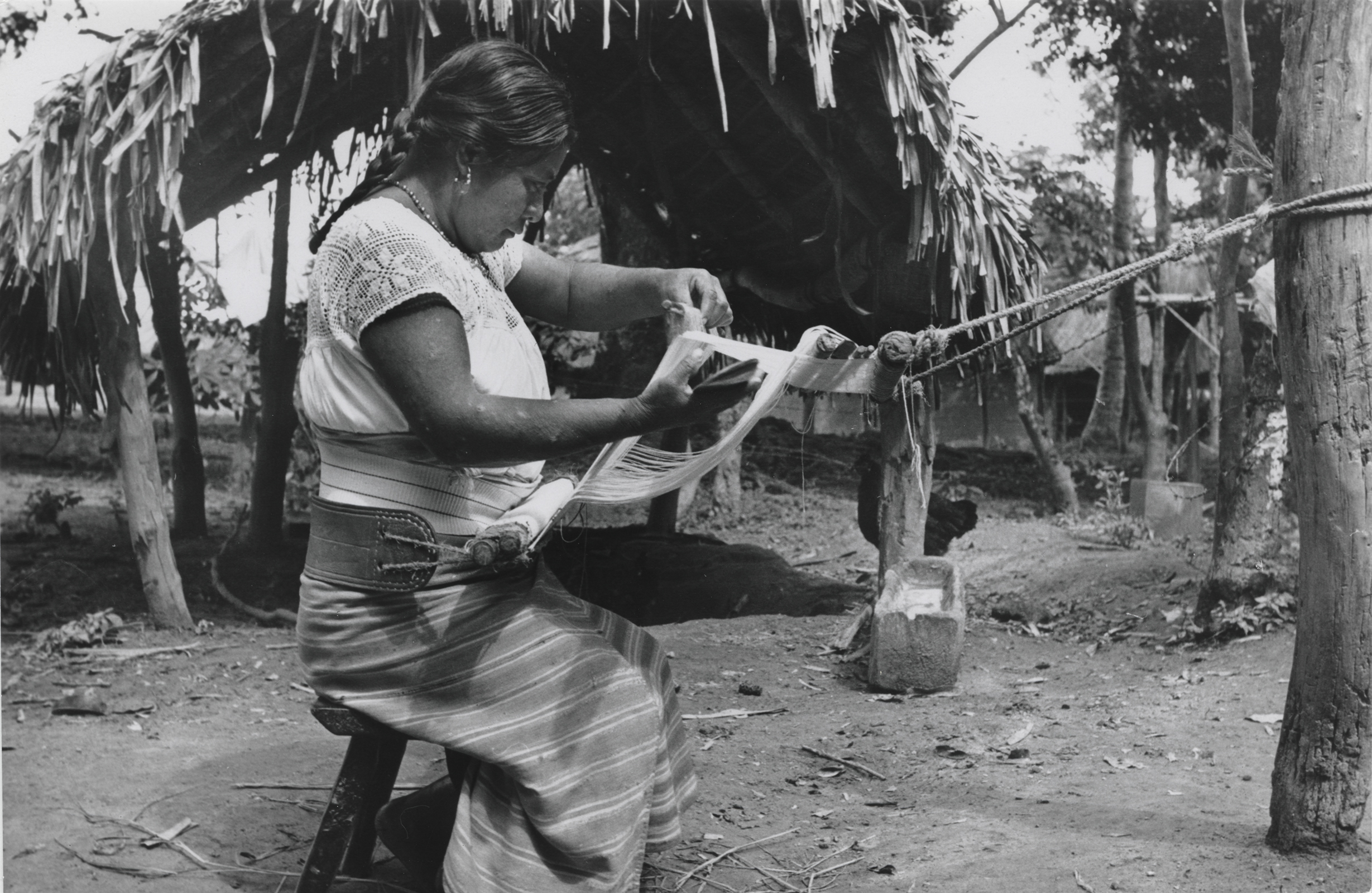 Mujer nahua tejiendo una servilleta en telar de cintura. Con la mano izquierda levanta uno de las varas de lizo, generando un espacio en los hilos de urdimbre, por donde introduce el machete. Ella viste un enredo (falda), el cual se compone de dos lienzos unidos verticalmente, este se encuentra sostenido a la cintura por una faja con textura acanalada con diseños de líneas verticales, que al ser puesta se ven en forma horizontal. Lleva una blusa, la cual está metida en el enredo, esta se compone de varias piezas, al contorno del cuello tiene motivos de guías de flores. Complementa su indumentaria con un collar de cuentas, aretes de "canastita" y lleva el cabello recogido en dos trenzas.