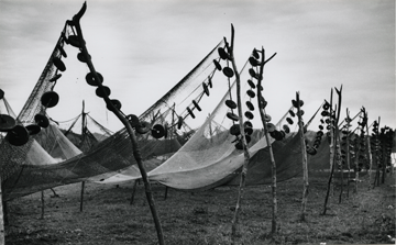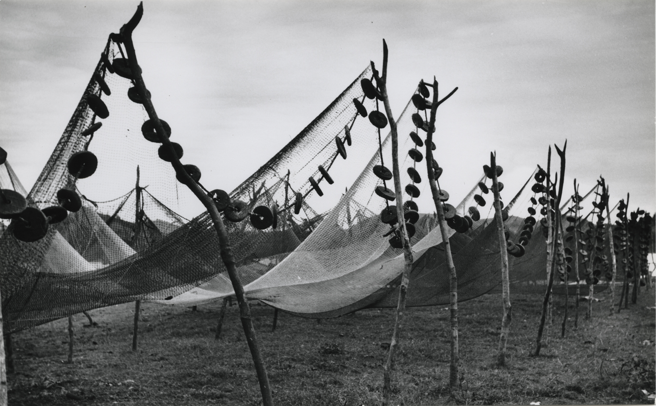 Se observa en la imagen la línea de flotadores, en las redes para pesca, las cuales se encuentran soportadas por troncos de madera enterrados en la tierra, dichos discos flotadores pueden estar hechos de corcho o suelas viejas de sandalias.