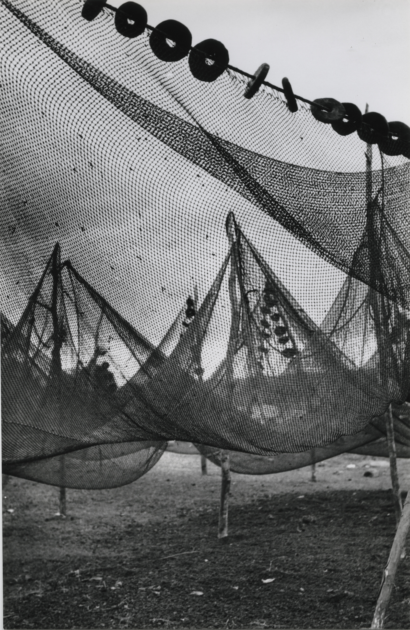 Redes para pesca suspendidas sobre troncos de madera enterrados en las riberas del lago de Catemaco.