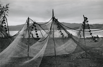 Redes para pesca suspendidas sobre troncos de madera enterrados en las riberas del lago de Catemaco.