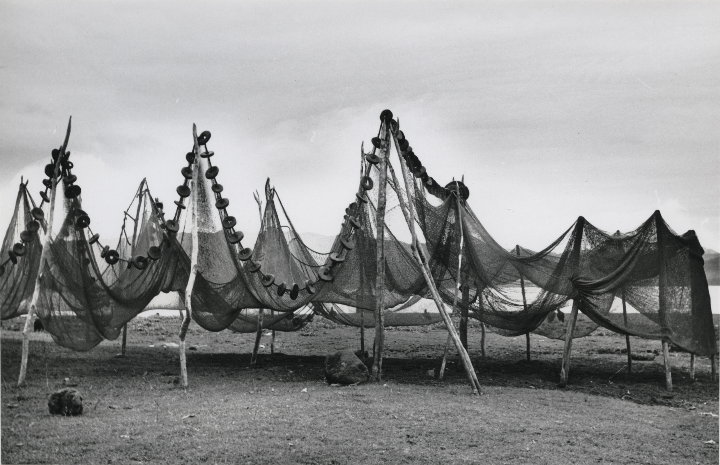 En las riberas del lago Catemaco se observan las redes para pesca suspendidas sobre unos troncos de madera.