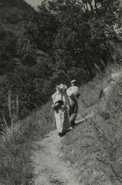 Kata y acompañante subiendo la vereda entre Coatlán e Ixcuintepec, Oaxaca, en la zona Mixe.