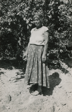 Mujer mixe de Ixcuintepec, Oaxaca. Viste un huipil corto (blusa), hecha de manta industrial y se compone de varias piezas unidas entre sí, los motivos bordados en la blusa fueron hechos con máquina de coser, la falda de pretina que lleva, es de tela industrial y complementa su indumentaria con un collar de cuentas. Ella está descalza y a sus espaldas hay un arbusto de tulipanes.