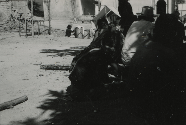 Mujer mixe de la comunidad de San Juan Guichicovi, sentada en el suelo, en la fiesta patronal de Santiago Ixcuintepec. Viste un huipil (blusa) corto, con franjas verticales hechas con máquina en puntada de cadenilla. Lleva el cabello trenzado con listones.