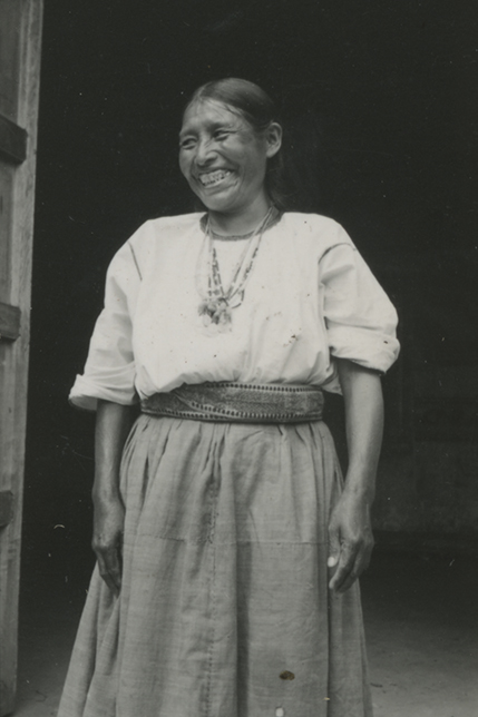 Mujer mixe de la comunidad de Tamazulápam, Oaxaca. Viste un huipil (blusa) amplio tejido en telar de cintura, compuesto de tres lienzos unidos verticalmente por randas, con una abertura circular bordada para introducir la cabeza, el huipil va metido en un enredo, también tejido en telar de cintura y este a su vez está sostenido en la cintura por una faja, la cual lleva brocado un motivo de danzante (probablemente hecho en la comunidad de Jalieza),complementa su indumentaria con varios collares de cuentas, con medallones y pequeñas bolitas hechas de lana. La imagen fue tomada en la comunidad mixe de Ixcuintepepc, Oaxaca.